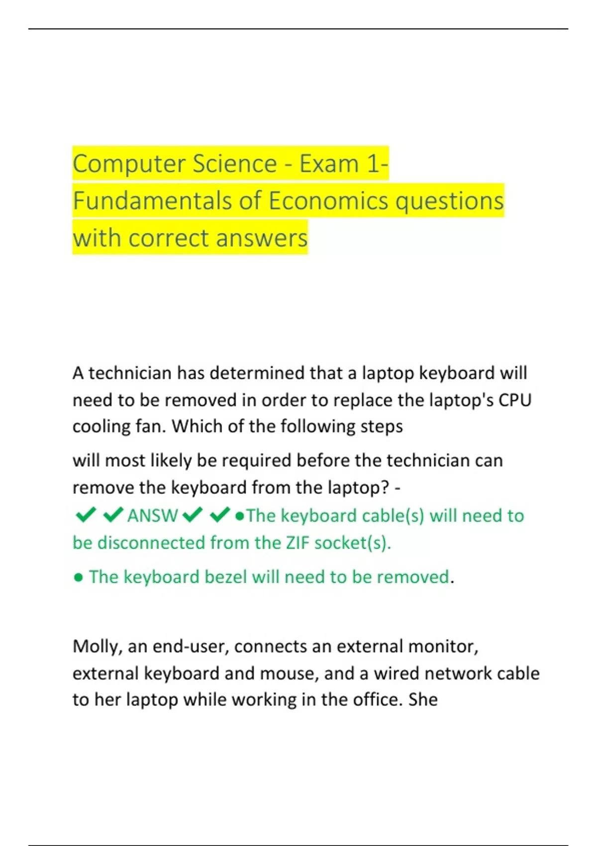A technician has determined that a laptop keyboard will need to be removed in order to replace the laptop's CPU cooling fan. Which of the following steps will most likely be required before the technician can remove the keyboard from the laptop? - ANSW●The keyboard cable(s) will need to be disconnected from the ZIF socket(s). ● The keyboard bezel will need to be removed. Molly, an end-user, connects an external monitor, external keyboard and mouse, and a wired network cable to her laptop while working in the office. She leaves the office frequently to meet with customers and takes the laptop with her. Disconnecting and reconnecting these external connections has become inconvenient. Which of the following devices will allow the user to disconnect and reconnect the laptop to the external connections with the least amount of effort? - ANSW● Port Replicator ● Docking Station A technician needs to service a laptop computer that is experiencing an intermittent problem with the display. Which of the following will be most effective at helping the technician complete the work in a timely and efficient manner? - ANSW● Document and label the location of the screws and cables before removing them. ● Organize and place all parts and screws in one place. What two different types of firmware may be used on motherboards? - ANSW● BIOS ● UEFI What type(s) of port transmit both digital audio and digital video with a single connector? - ANSW● DisplayPort ● HDMI