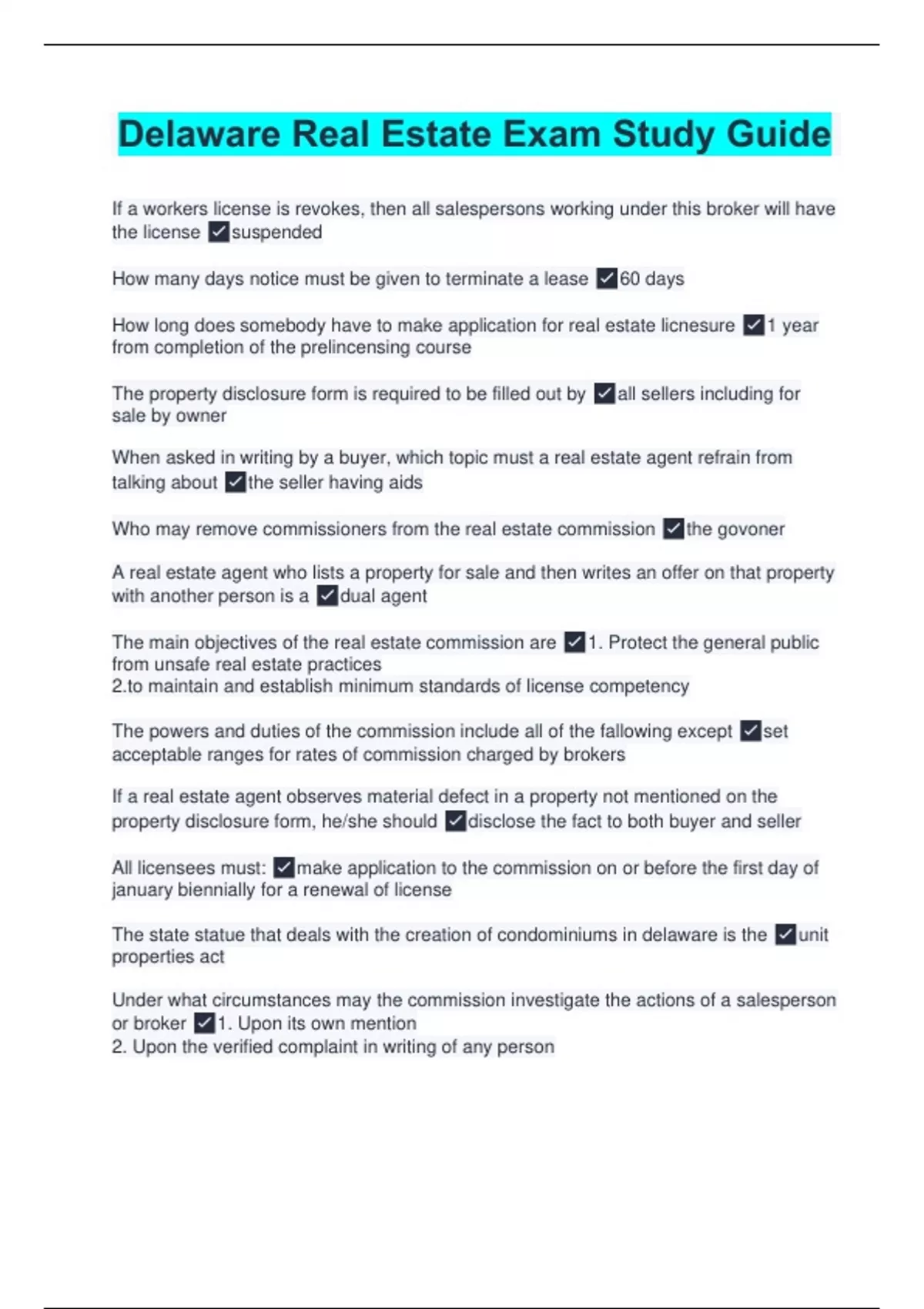 If a workers license is revokes, then all salespersons working under this broker will have the license suspended How many days notice must be given to terminate a lease 60 days How long does somebody have to make application for real estate licnesure 1 year from completion of the prelincensing course The property disclosure form is required to be filled out by all sellers including for sale by owner When asked in writing by a buyer, which topic must a real estate agent refrain from talking about the seller having aids Who may remove commissioners from the real estate commission the govoner A real estate agent who lists a property for sale and then writes an offer on that property with another person is a dual agent The main objectives of the real estate commission are 1. Protect the general public from unsafe real estate practices maintain and establish minimum standards of license competency The powers and duties of the commission include all of the fallowing except set acceptable ranges for rates of commission charged by brokers If a real estate agent observes material defect in a property not mentioned on the property disclosure form, he/she should disclose the fact to both buyer and seller All licensees must: make application to the commission on or before the first day of january biennially for a renewal of license The state statue that deals with the creation of condominiums in delaware is the unit properties act Under what circumstances may the commission investigate the actions of a salesperson or broker 1. Upon its own mention 2. Upon the verified complaint in writing of any person
