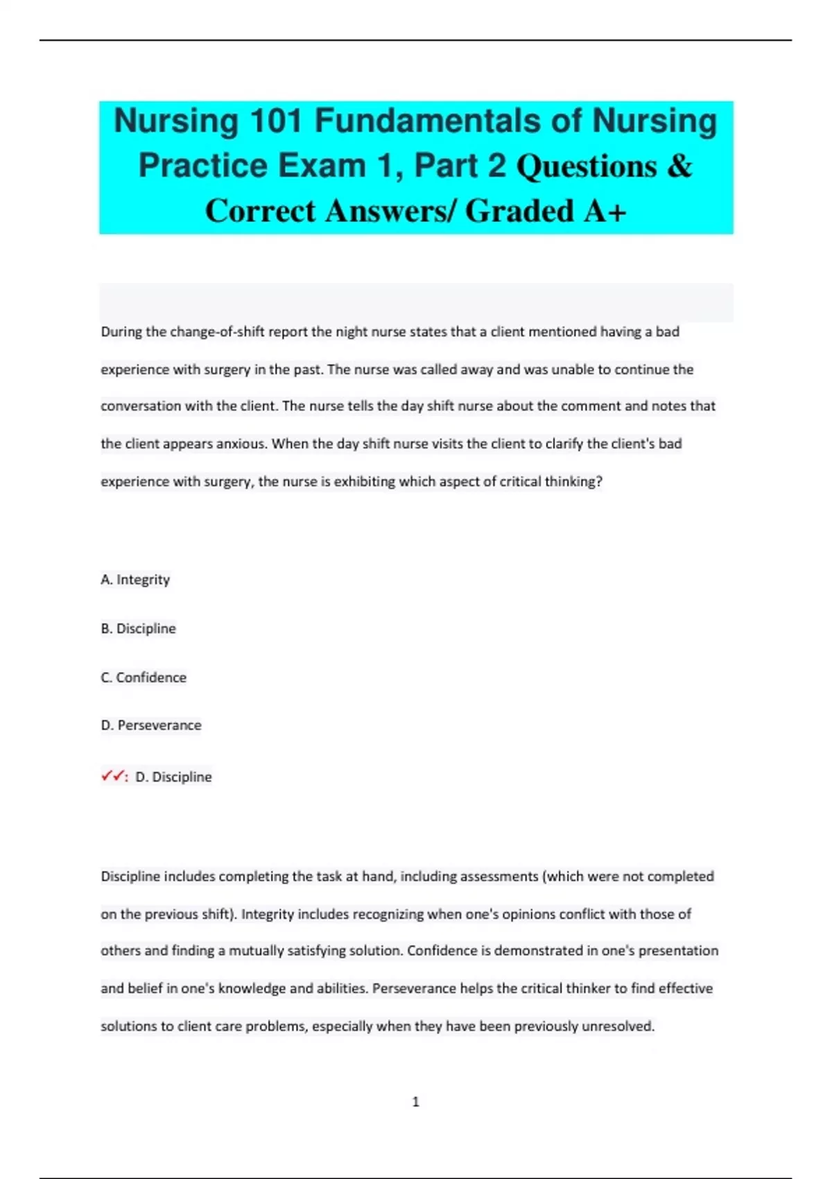 Nursing 101 Fundamentals of Nursing Practice Exam 1, Part 2 Questions & Correct Answers/ Graded A+