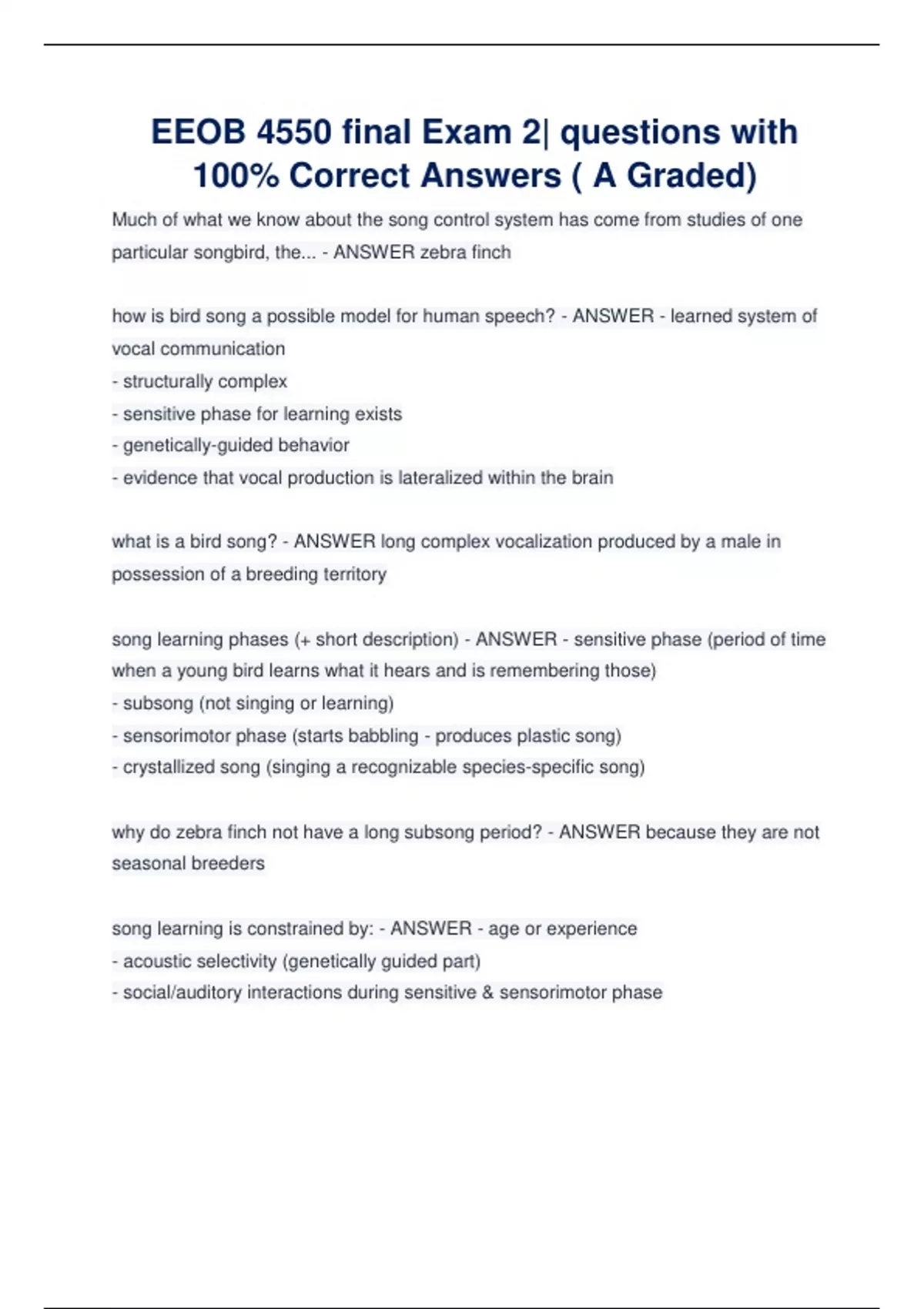 EEOB 4550 final Exam 2| questions with 100% Correct Answers ( A Graded)