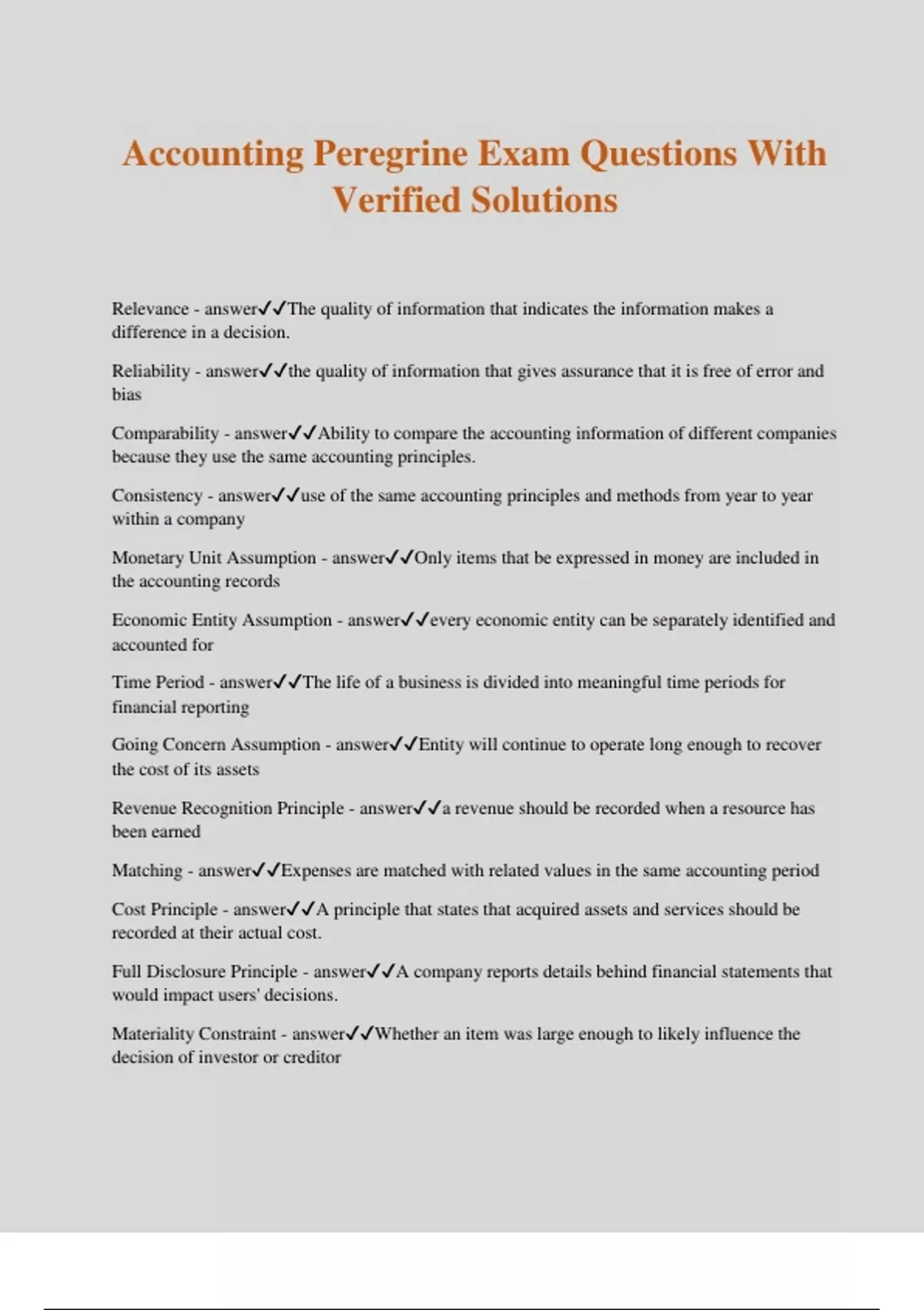 Accounting Peregrine Exam Questions With Verified Solutions Relevance - answerThe quality of information that indicates the information makes a difference in a decision. Reliability - answerthe quality of information that gives assurance that it is free of error and bias Comparability - answerAbility to compare the accounting information of different companies because they use the same accounting principles. Consistency - answeruse of the same accounting principles and methods from year to year within a company Monetary Unit Assumption - answerOnly items that be expressed in money are included in the accounting records Economic Entity Assumption - answerevery economic entity can be separately identified and accounted for Time Period - answerThe life of a business is divided into meaningful time periods for financial reporting Going Concern Assumption - answerEntity will continue to operate long enough to recover the cost of its assets Revenue Recognition Principle - answera revenue should be recorded when a resource has been earned Matching - answerExpenses are matched with related values in the same accounting period Cost Principle - answerA principle that states that acquired assets and services should be recorded at their actual cost. Full Disclosure Principle - answerA company reports details behind financial statements that would impact users' decisions. Materiality Constraint - answerWhether an item was large enough to likely influence the decision of investor or creditor
