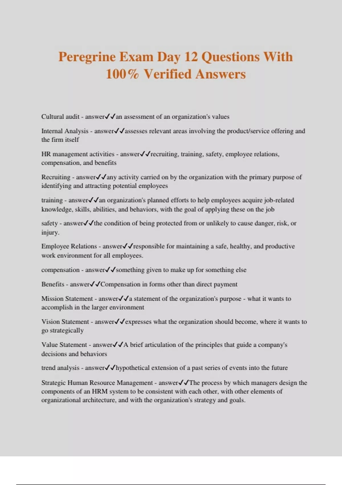 Peregrine Exam Day 12 Questions With 100% Verified Answers Cultural audit - answeran assessment of an organization's values Internal Analysis - answerassesses relevant areas involving the product/service offering and the firm itself HR management activities - answerrecruiting, training, safety, employee relations, compensation, and benefits Recruiting - answerany activity carried on by the organization with the primary purpose of identifying and attracting potential employees training - answeran organization's planned efforts to help employees acquire job-related knowledge, skills, abilities, and behaviors, with the goal of applying these on the job safety - answerthe condition of being protected from or unlikely to cause danger, risk, or injury. Employee Relations - answerresponsible for mainta