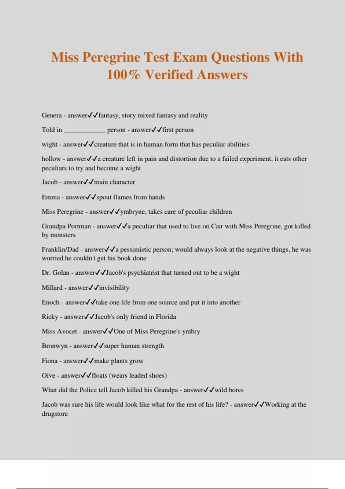 miss peregrine test exam questions with 100 verif
