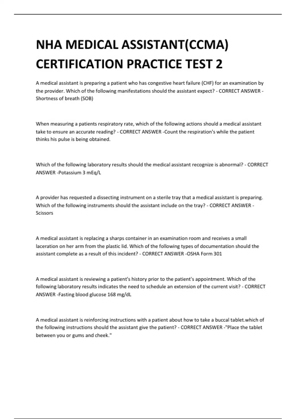 NHA MEDICAL ASSISTANT(CCMA) CERTIFICATION PRACTICE TEST 2 A medical assistant is preparing a patient who has congestive heart failure (CHF) for an examination by the provider. Which of the following manifestations should the assistant expect? - CORRECT ANSWER Shortness of breath (SOB) When measuring a patients respiratory rate, which of the following actions should a medical assistant take to ensure an accurate reading? - CORRECT ANSWER -Count the respiration's while the patient thinks his pulse is being obtained. Which of the following laboratory results should the medical assistant recognize is abnormal? - CORRECT ANSWER -Potassium 3 mEq/L A provider has requested a dissecting instrument on a sterile tray that a medical assistant is preparing. Which of the following instruments should the assistant include on the tray? - CORRECT ANSWER Scissors A medical assistant is replacing a sharps container in an examination room and receives a small laceration on her arm from the plastic lid. Which of the following types of documentation should the assistant complete as a result of this incident? - CORRECT ANSWER -OSHA Form 301 A medical assistant is reviewing a patient's history prior to the patient's appointment. Which of the following laboratory results indicates the need to schedule an extension of the current visit? - CORRECT ANSWER -Fasting blood glucose 168 mg/dL A medical assistant is reinforcing instructions with a patient about how to take a buccal of the following instructions should the assistant give the patient? - CORRECT ANSWER -"Place the tablet between you or gums and cheek."