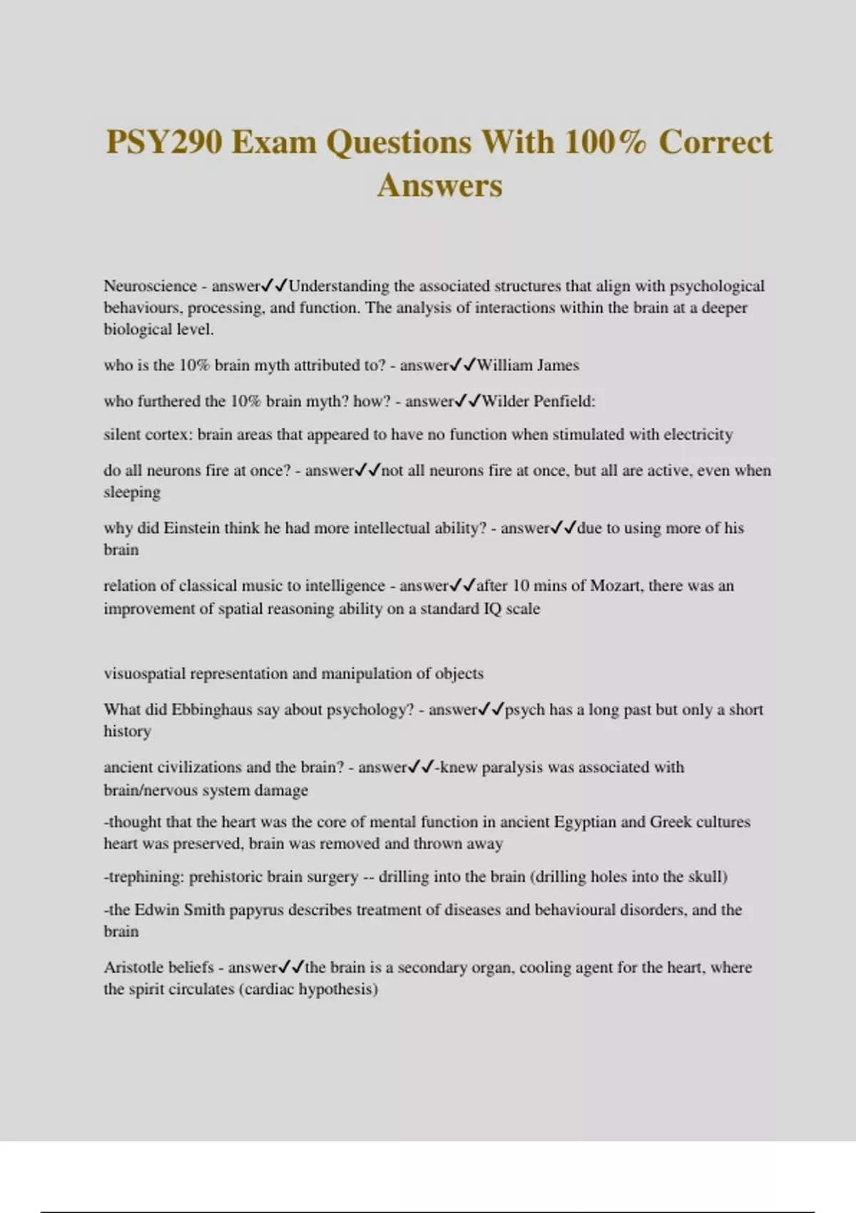 PSY290 Exam Questions With 100% Correct Answers Neuroscience - answerUnderstanding the associated structures that align with psychological behaviours, processing, and function. The analysis of interactions within the brain at a deeper biological level. who is the 10% brain myth attributed to? - answerWilliam James who furthered the 10% brain myth? how? - answerWilder Penfield: silent cortex: brain areas that appeared to have no function when stimulated with electricity do all neurons fire at once? - answernot all neurons fire at once, but all are active, even when sleeping why did Einstein think he had more intellectual ability? - answerdue to using more of his brain relation of classical music to intelligence - answerafter 10 mins of Mozart, there was an improvement of spatial reasoning ability on a standard IQ scale visuospatial representation and manipulation of objects What did Ebbinghaus say about psychology? - answerpsych has a long past but only a short history ancient civilizations and the brain? - answer-knew paralysis was associated with brain/nervous system damage -thought that the heart was the core of mental function in ancient Egyptian and Greek cultures heart was preserved, brain was removed and thrown away -trephining: prehistoric brain surgery -- drilling into the brain (drilling holes into the skull) -the Edwin Smith papyrus describes treatment of diseases and behavioural disorders, and the brain Aristotle beliefs - answerthe brain is a secondary organ, cooling agent for the heart, where the spirit circulates (cardiac hypothesis) Hippocrates - answerwrote that the brain is the seat of thoughts and emotions, that Aristotle was wrong Galen - answer-experience in treating brain-injured gladiators led him to propose that behaviour results from connections between the brain and nerves (animal spirits from the brain through nerves to the body) -focus on ventricles rather than the outer matter da Vinci - answerpioneered anatomical drawings, including the use of cross sections from direct observation Descartes - answerexplained animal behaviour in terms of a machine, proposed the concept of spinal reflexes and their neural pathway -intense heat on the toe causes nervous activity to flow up the nerve to the brain, reflected to leg muscles, causes contraction and withdrawal of the foot -after observing a fountain that would spray water into one's face when stepped upon, he believed that the brain sat upon glands that it would apply pressure to and utilize -argued that free will and moral choice could not come form a mere machine -asserted that humans had a nonmaterial soul and a material body: -soul governed behaviour through a point of contact in the brain (possibly pineal gland) -dualism Descartes also proposed that an impulse is sent to the brain (reacting from a stimulus like a flame) in one channel, then reacted to and sent back in a second channel to create output (movement). He called it a reflection, wherein the word reflex was then derived and conceptualized Luigi Galvani - answer-found that neural communication has an electrical nature (through stimulating frog legs) -When stimulating deceased frogs' legs he saw response that indicated to him an electrical connection between brain functioning and bodily response Charles Darwin - answerrational behaviour can be explained by workings of the nervous system...no need for non-material mind (18th century) -materialism: "a theory that physical matter is the only or fundamental reality and that all being and processes and phenomena can be explained as manifestations or results of matter" Francis Gall - answersuggested that the brain would grow after use → like any other visible muscle