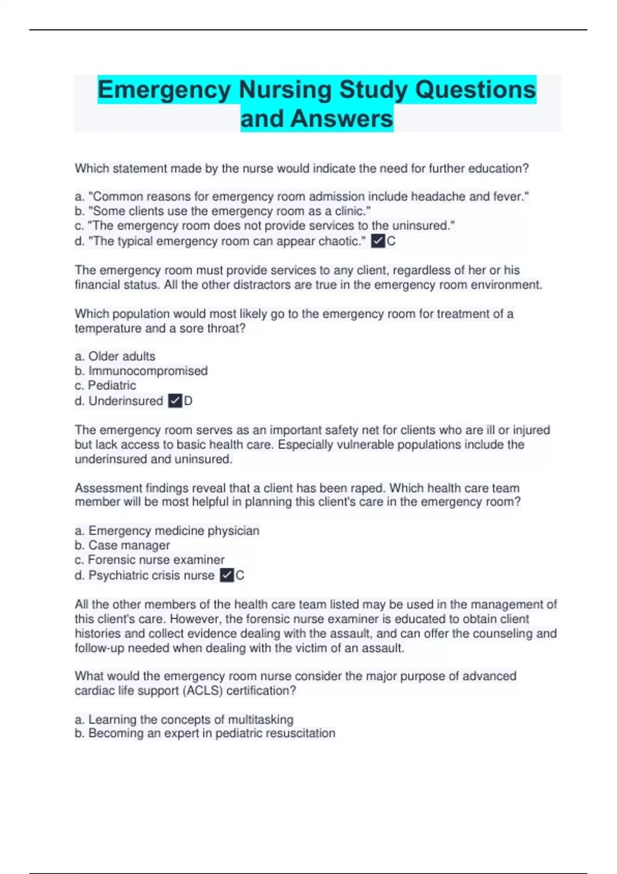 Which statement made by the nurse would indicate the need for further education? a. "Common reasons for emergency room admission include headache and fever." b. "Some clients use the emergency room as a clinic." c. "The emergency room does not provide services to the uninsured." d. "The typical emergency room can appear chaotic." C The emergency room must provide services to any client, regardless of her or his financial status. All the other distractors are true in the emergency room environment. Which population would most likely go to the emergency room for treatment of a temperature and a sore throat? a. Older adults b. Immunocompromised c. Pediatric d. Underinsured D The emergency room serves as an important safety net for clients who are ill or injured but lack access to basic health care. Especially vulnerable populations include the underinsured and uninsured. Assessment findings reveal that a client has been raped. Which health care team member will be most helpful in planning this client's care in the emergency room? a. Emergency medicine physician b. Case manager c. Forensic nurse examiner d. Psychiatric crisis nurse C All the other members of the health care team listed may be used in the management of this client's care. However, the forensic nurse examiner is educated to obtain client histories and collect evidence dealing with the assault, and can offer the counseling and follow-up needed when dealing with the victim of an assault. What would the emergency room nurse consider the major purpose of advanced cardiac life support (ACLS) certification? a. Learning the concepts of multitasking b. Becoming an expert in pediatric resuscitation c. Demonstrating competence in adult emergency situations d. Demonstrating basic first aid skills C Certification marks successful completion of a particular course of study and nursing specialty. The ACLS course builds on basic cardiac life support (BCLS) content to include special resuscitation situations in the adult population. The emergency room nurse is caring for the following clients. Which client does the nurse prioritize to see first? a. Blood pressure 100/60 mm Hg, right wrist painful and swollen b. Complaining of chest pain and diaphoresis c. Complaining of difficulty swallowing and nausea d. Respiratory rate of 28/min and temperature of 101° F B