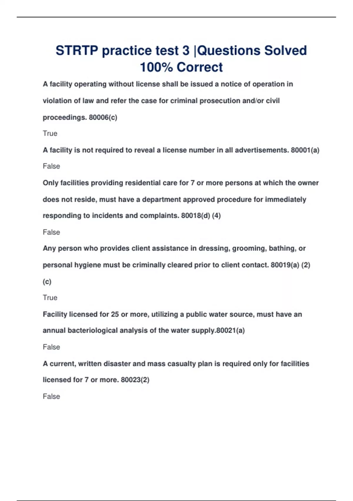 A facility operating without license shall be issued a notice of operation in violation of law and refer the case for criminal prosecution and/or civil proceedings. 80006(c) True A facility is not required to reveal a license number in all advertisements. 80001(a) False Only facilities providing residential care for 7 or more persons at which the owner does not reside, must have a department approved procedure for immediately responding to incidents and complaints. 80018(d) (4) False