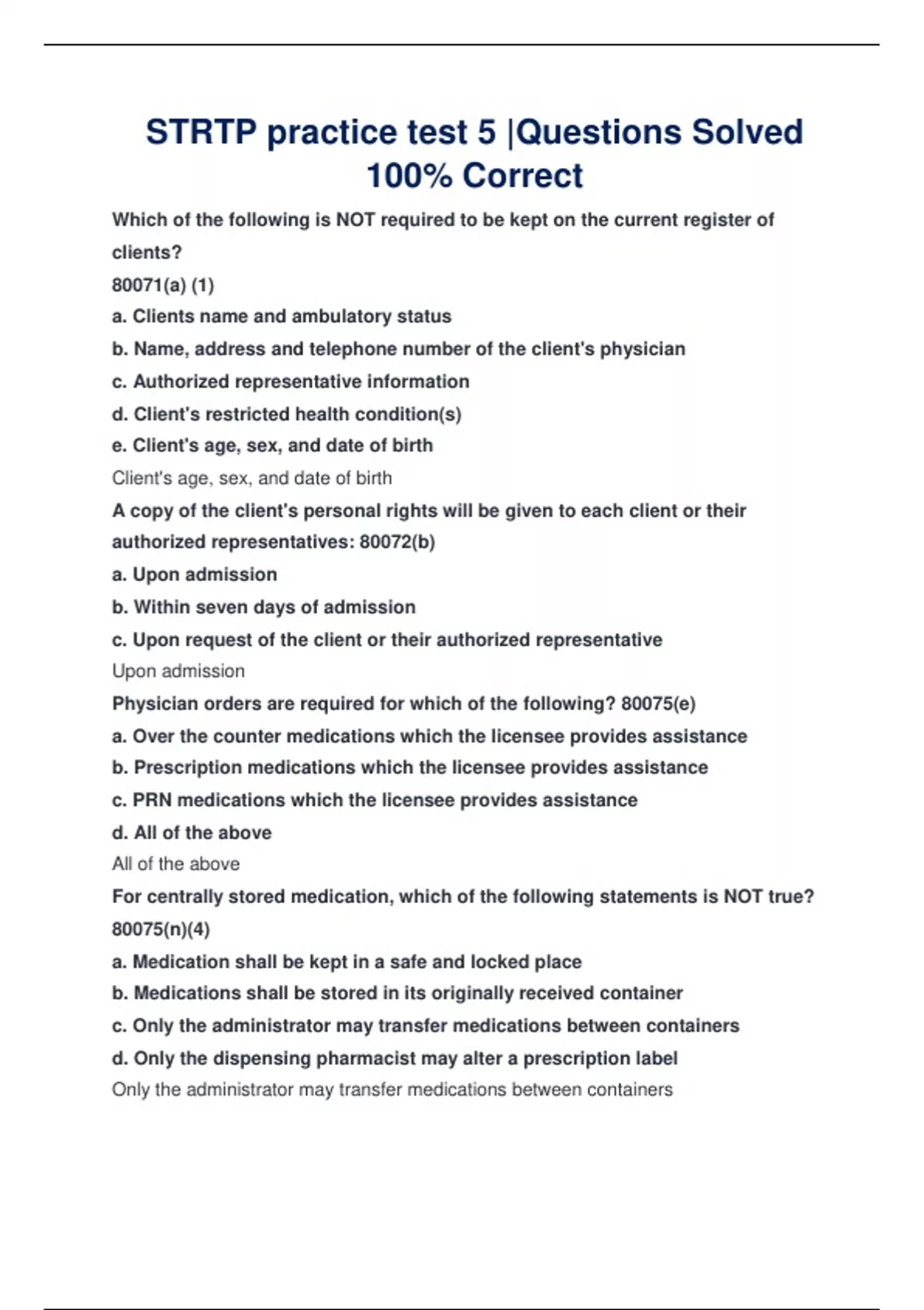 Which of the following is NOT required to be kept on the current register of clients? 80071(a) (1) a. Clients name and ambulatory status b. Name, address and telephone number of the client's physician c. Authorized representative information d. Client's restricted health condition(s) e. Client's age, sex, and date of birth Client's age, sex, and date of birth