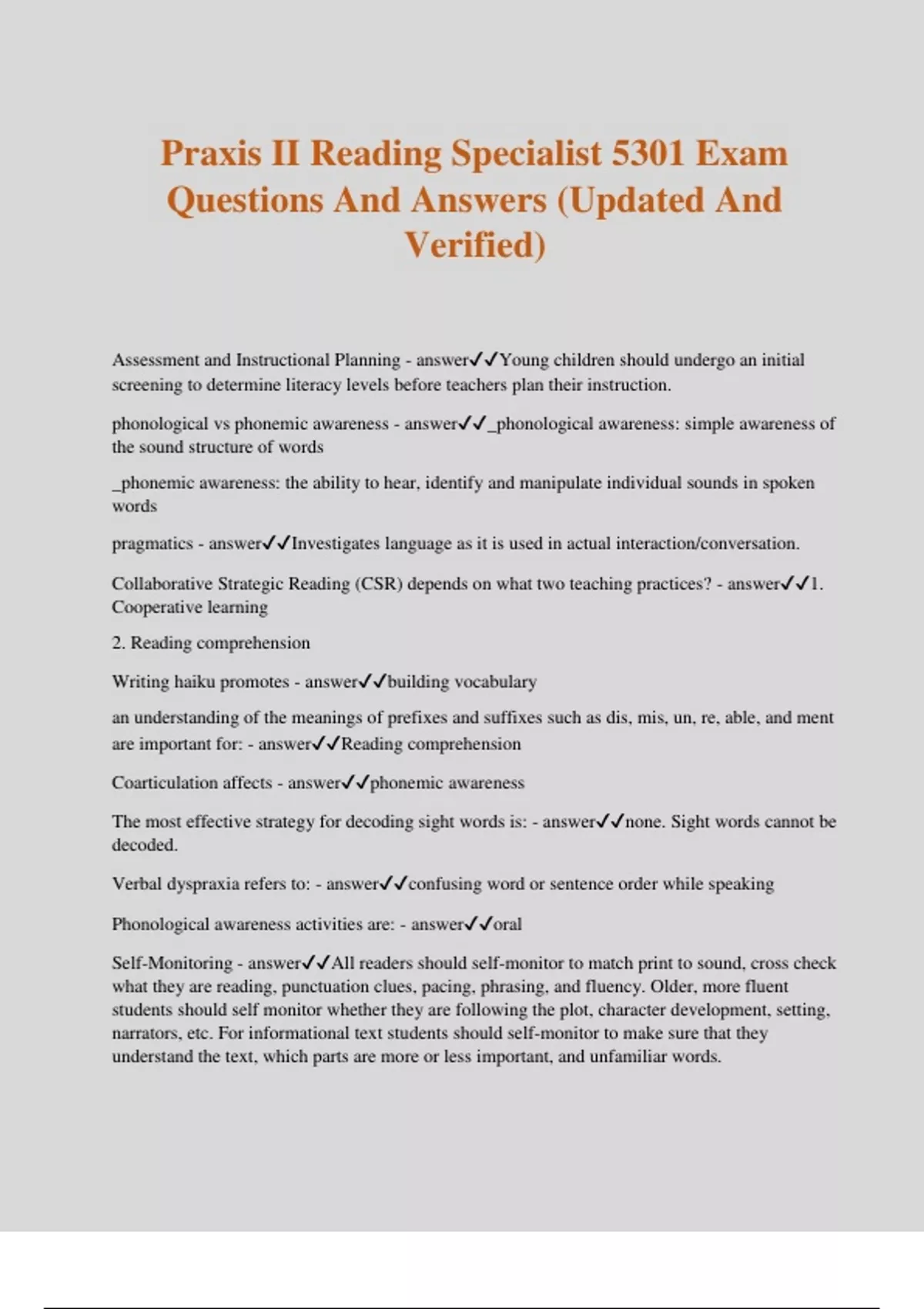 Praxis II Reading Specialist 5301 Exam Questions And Answers (Updated And Verified)
