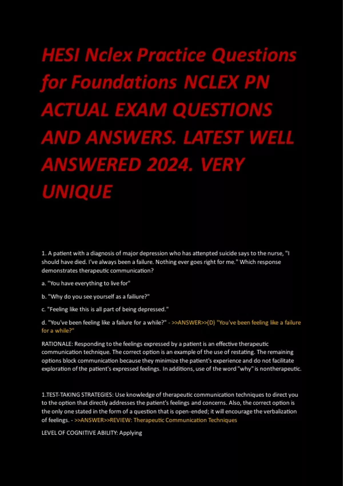HESI Nclex Practice Questions for Foundations NCLEX PN ACTUAL EXAM QUESTIONS AND ANSWERS. LATEST WELL ANSWERED 2024. VERY UNIQUE