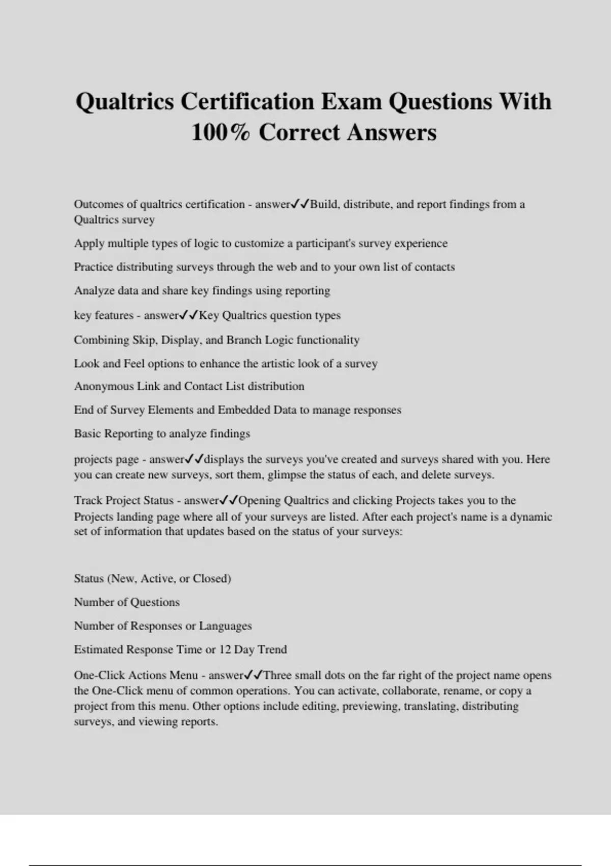 Qualtrics Certification Exam Questions With 100% Correct Answers Outcomes of qualtrics certification - answerBuild, distribute, and report findings from a Qualtrics survey Apply multiple types of logic to customize a participant's survey experience Practice distributing surveys through the web and to your own list of contacts Analyze data and share key findings using reporting key features - answerKey Qualtrics question types Combining Skip, Display, and Branch Logic functionality Look and Feel options to enhance the artistic look of a survey Anonymous Link and Contact List distribution End of Survey Elements and Embedded Data to manage responses Basic Reporting to analyze findings projects page - answerdisplays the surveys you've created and surveys shared with you. Here you can create new surveys, sort them, glimpse the status of each, and delete surveys. Track Project Status - answerOpening Qualtrics and clicking Projects takes you to the Projects landing page where all of your surveys are listed. After each project's name is a dynamic set of information that updates based on the status of your surveys: Status (New, Active, or Closed) Number of Questions Number of Responses or Languages Estimated Response Time or 12 Day Trend One-Click Actions Menu - answerThree small dots on the far right of the project name opens the One-Click menu of common operations. You can activate, collaborate, rename, or copy a project from this menu. Other options include editing, previewing, translating, distributing surveys, and viewing reports. Delete Projects - answerDelete a Project from the One-Click menu. Qualtrics will caution you by asking for a confirmation: Read the Delete Project warning. Be sure you don't need any of the data or reports from this project. Select All data related to this project will be permanently deleted. Click Delete Project. View Buttons - answerToggle between the two View buttons to condense or expand the way project names display. The first option reveals the most status updates per survey. The second displays more projects in the list. The Sort By menu can display projects how? - answeralphabetically by project name or by modification date. You can also sort by owner, group, project type, or by the date the survey was created. The first time you pick an option from the Sort By menu (such as Last Modified or Project Name) your projects will be listed in - answerdescending order To reverse the list to ascending order... - answerchoose the same option again and the list will flip upside down. what do you mark your critically important surveys with? and how? - answera star. Display Starred projects by clicking Starred in the Sort By menu. To add a question to a survey... - answerclick Create a New Question. how can you recover deleted questions? - answerfrom the Trash at the bottom of the survey. which questions are added by default? - answermultiple choice To change question types... - answerGo to the Editing Pane (on the right of your question). Click Change Question Type. Pick any new question type. editing pane and its special feature - answerhow to change question types to the right of your question The Editing Pane automatically customizes its options to match the newly selected question type. Actions section of the Editing Pane - answerlets you Copy, Move, and Preview questions. One option lets you place questions on separate pages. To create Page Breaks: - answerScroll to the Actions section in the Editing Pane. Click Add Page Break. the most common question type - answerMC features of MC questions - answerIncrease or decrease the number of choices Flip the way answers are displayed Add images Change formatting and colors Descriptive Text and Graphic questions don't have... - answeranswer choice options. only texts and graphics are displayed. They are often used for introductions or instructions. Matrix Table questions can collect more information than Multiple Choice options because... - answeryou can condense several questions into a single display. The most common Matrix Table question is built upon the - answerlikert scale. But others, like Bipolar and MaxDiff, are also available from the Editing Pane. Change the size of your text box from... Set character limits through... - answerText Type in the Editing Pane. Under Validation Type, set character limits to restrict response length. Rank Order - answerdetermine an order of preference for a list of items by respondents selecting a value, typing in values, or dragging and dropping answers into a rank order. slider - answerSlider questions use a draggable bar to indicate preference and are an interactive alternative to Matrix Table questions. what should you do to style sliders? - answertry bars, sliding handles, or stars. Set minimum or maximum values. You can even add labels or alter the number of visible grid lines. Side by Side - answerSide by Side options ask multiple questions in a condensed table. Each column is treated as a separate question possessing its own structure, format, and choice options. how does qualtrics save your projects? - answerautomatically whenever you click outside of a question or move to a different section. should you have qualtrics in multiple tabs at a time? - answerno, this may interfere with the Autosave and override changes. what happens if you don't autosave and the browser times out? - answerMost browsers have a timeout of about an hour. If you're working on a question and don't autosave save within that hour, the browser may time out and your unsaved work may be lost.