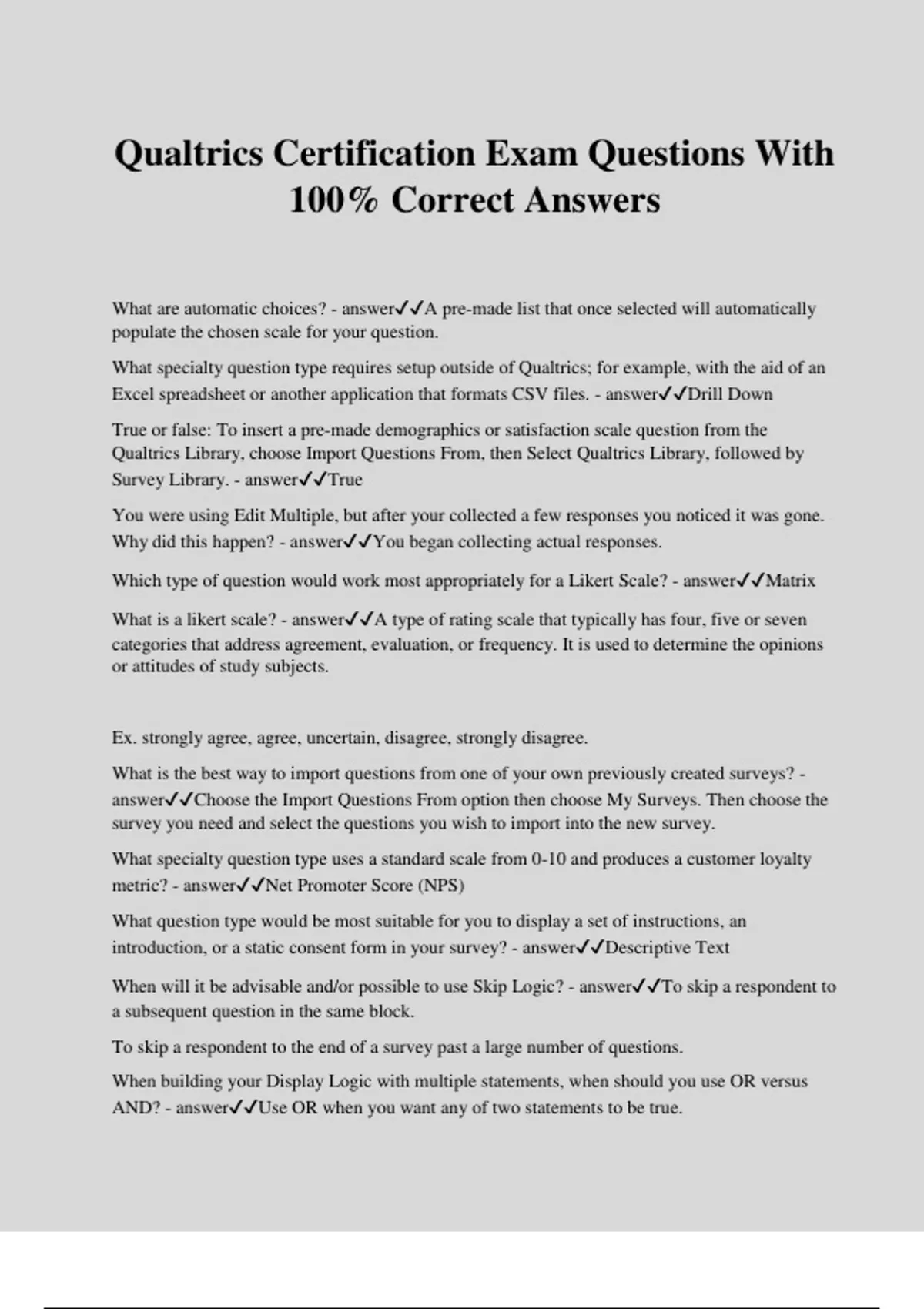 Qualtrics Certification Exam Questions With 100% Correct Answers What are automatic choices? - answerA pre-made list that once selected will automatically populate the chosen scale for your question. What specialty question type requires setup outside of Qualtrics; for example, with the aid of an Excel spreadsheet or another application that formats CSV files. - answerDrill Down True or false: To insert a pre-made demographics or satisfaction scale question from the Qualtrics Library, choose Import Questions From, then Select Qualtrics Library, followed by Survey Library. - answerTrue You were using Edit Multiple, but after your collected a few responses you noticed it was gone. Why did this happen? - answerYou began collecting actual responses. Which type of question would work most appropriately for a Likert Scale? - answerMatrix What is a likert scale? - answerA type of rating scale that typically has four, five or seven categories that address agreement, evaluation, or frequency. It is used to determine the opinions or attitudes of study subjects. Ex. strongly agree, agree, uncertain, disagree, strongly disagree. What is the best way to import questions from one of your own previously created surveys? - answerChoose the Import Questions From option then choose My Surveys. Then choose the survey you need and select the questions you wish to import into the new survey. What specialty question type uses a standard scale from 0-10 and produces a customer loyalty metric? - answerNet Promoter Score (NPS) What question type would be most suitable for you to display a set of instructions, an introduction, or a static consent form in your survey? - answerDescriptive Text When will it be advisable and/or possible to use Skip Logic? - answerTo skip a respondent to a subsequent question in the same block. To skip a respondent to the end of a survey past a large number of questions. When building your Display Logic with multiple statements, when should you use OR versus AND? - answerUse OR when you want any of two statements to be true.