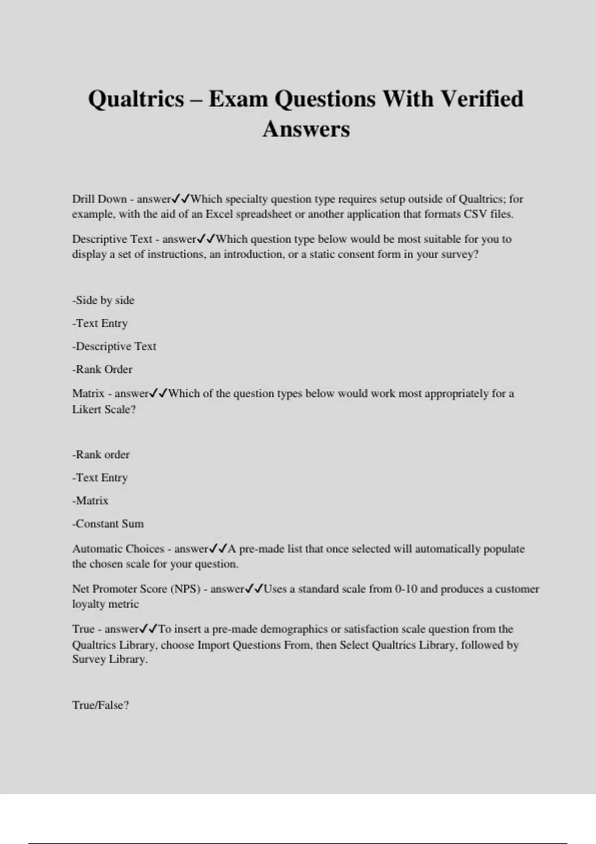 Qualtrics – Exam Questions With Verified Answers Drill Down - answerWhich specialty question type requires setup outside of Qualtrics; for example, with the aid of an Excel spreadsheet or another application that formats CSV files. Descriptive Text - answerWhich question type below would be most suitable for you to display a set of instructions, an introduction, or a static consent form in your survey? -Side by side -Text Entry -Descriptive Text -Rank Order Matrix - answerWhich of the question types below would work most appropriately for a Likert Scale? -Rank order -Text Entry -Matrix -Constant Sum Automatic Choices - answerA pre-made list that once selected will automatically populate the chosen scale for your question. Net Promoter Score (NPS) - answerUses a standard scale from 0-10 and produces a customer loyalty metric True - answerTo insert a pre-made demographics or satisfaction scale question from the Qualtrics Library, choose Import Questions From, then Select Qualtrics Library, followed by Survey Library. True/False? You began collecting actual responses - answerYou were using Edit Multiple, but after you collected a few responses you noticed it was gone. Why did this happen? Choose the Import Questions From option then choose My Surveys. Then choose the survey you need and select the questions you wish to import into the new survey - answerWhat is the best way to import questions from one of your own previously created surveys? 2 & 4 - answerWhen will it be advisable and/or possible to use Skip Logic? Select all that apply. 1) To set multiple conditions that need to be triggered to move a respondent to a future question or to a later block 2) To skip a respondent to the end of a survey past a large number of questions 3) To send a respondent back to a previous question 4) To skip a respondent to a subsequent question in the same block 1 & 2 - answerWhen will it be advisable and/or possible to use Display Logic? Select all that apply. 1) Use display logic when you have a previous condition that came before the current question 2) Use display logic when you have multiple conditions to consider 3) Use display logic when you're jumping past (or hiding) a lot of unnecessary questions based on the current question Display Logic - answerWhich of the logic types below would be most appropriate to hide questions and/or answer choices from some respondents while showing them to other respondents? -Hide Logic -Branch Logic -Skip Logic -Display Logic 1 & 3 - answerWhen building your Display Logic with multiple statements, when should you use OR versus AND? Select all that apply.