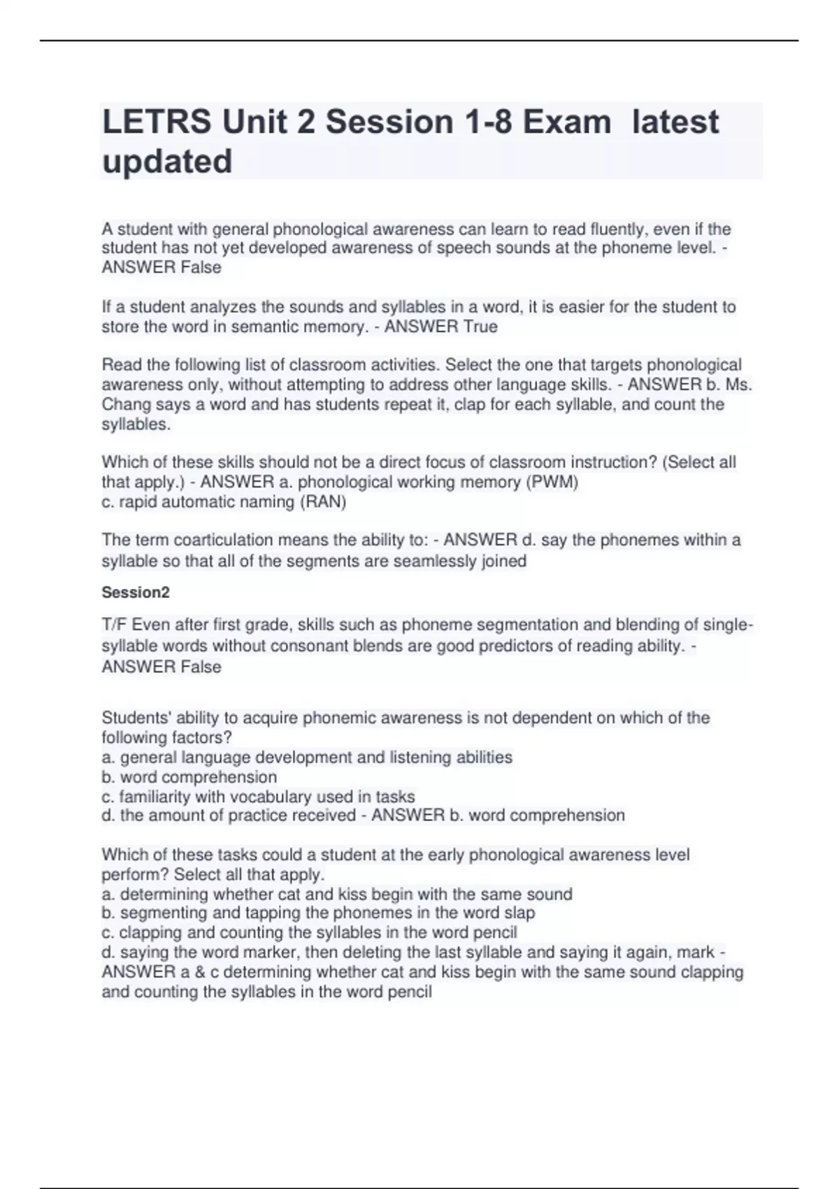 LETRS Unit 2 Session 1-8 Exam latest updated 2023 Q&A