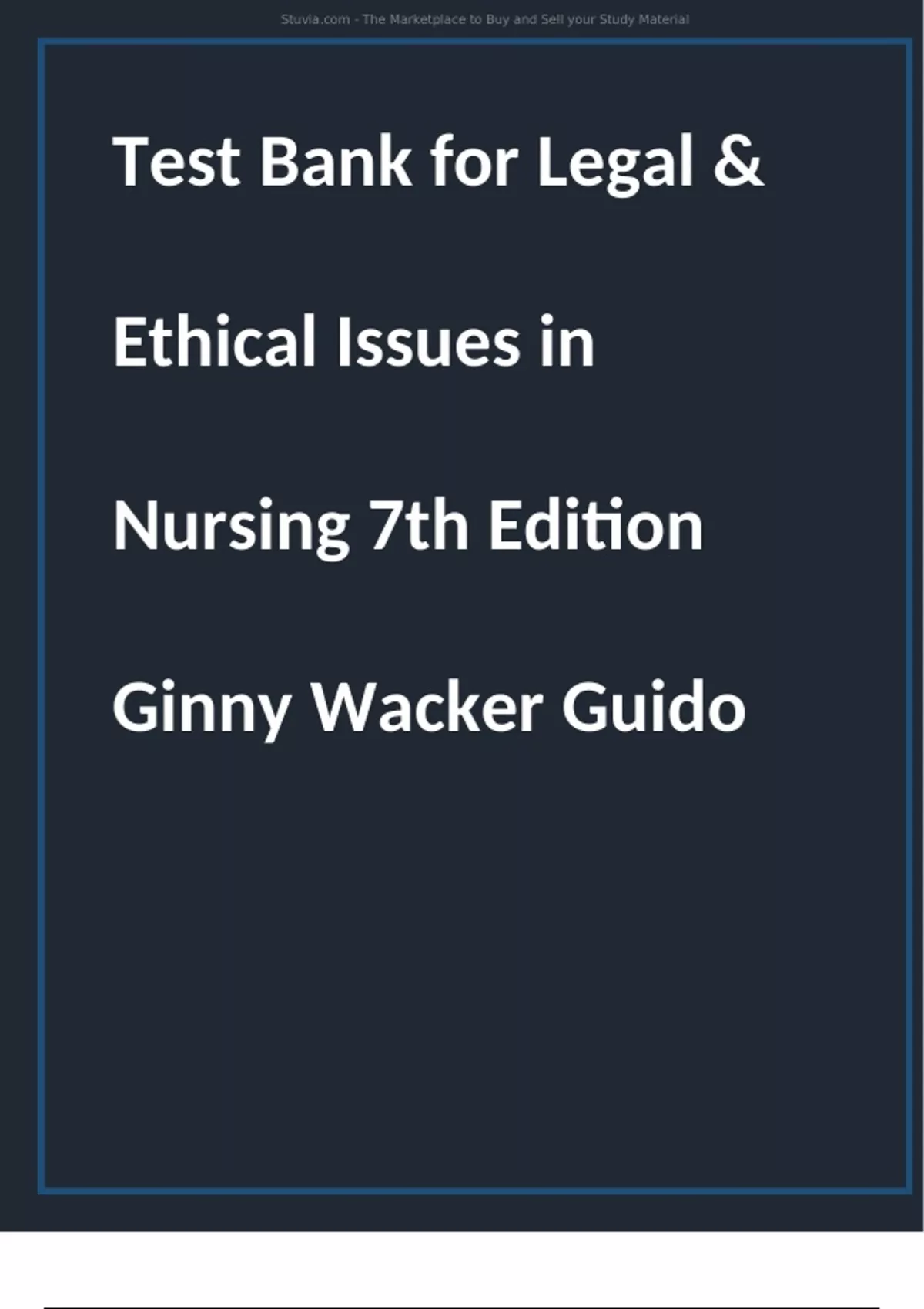 Test Bank for Legal & Ethical Issues in Nursing, 7th Edition by Ginny Wacker Guido. Table of contents: PART 1: INTRODUCTION TO THE LAW AND THE JUDICIAL PROCESS 1. Legal Concepts and the Judicial Process 2. Anatomy of a Lawsuit PART 2: ETHICS IN NURSING PRACTICE 3. Introduction to Ethics 4. Application of Ethics in Nursing Practice Settings PART 3: LIABILITY ISSUES 5. Standards of Care 6. Tort Law 7. Nursing Liability: Defenses 8. Informed Consent 9. Patient Self-Determination 10. Documentation and Confidentiality 11. Professional Liability Insurance PART 4: IMPACT OF THE LAW ON THE PROFESSIONAL PRACTICE OF NURSING 12. Nurse Practice Acts, Licensure, and the Scope of Practice 13. Advanced Nursing Practice Roles 14. Corporate Liability Issues and Employment Laws 15. Federal Laws: The Americans with Disabilities Act of 1990 and the Civil Rights Act of 1991 16. Nursing Management and the Nurse-Manager 17. Delegation, Supervision, and Patient Advocacy Issues PART 5: IMPACT OF THE LAW ON NURSING IN SELECTED PRACTICE SETTINGS 18. Nursing in Acute Care Settings 19. Nursing in Ambulatory and Managed Care Settings