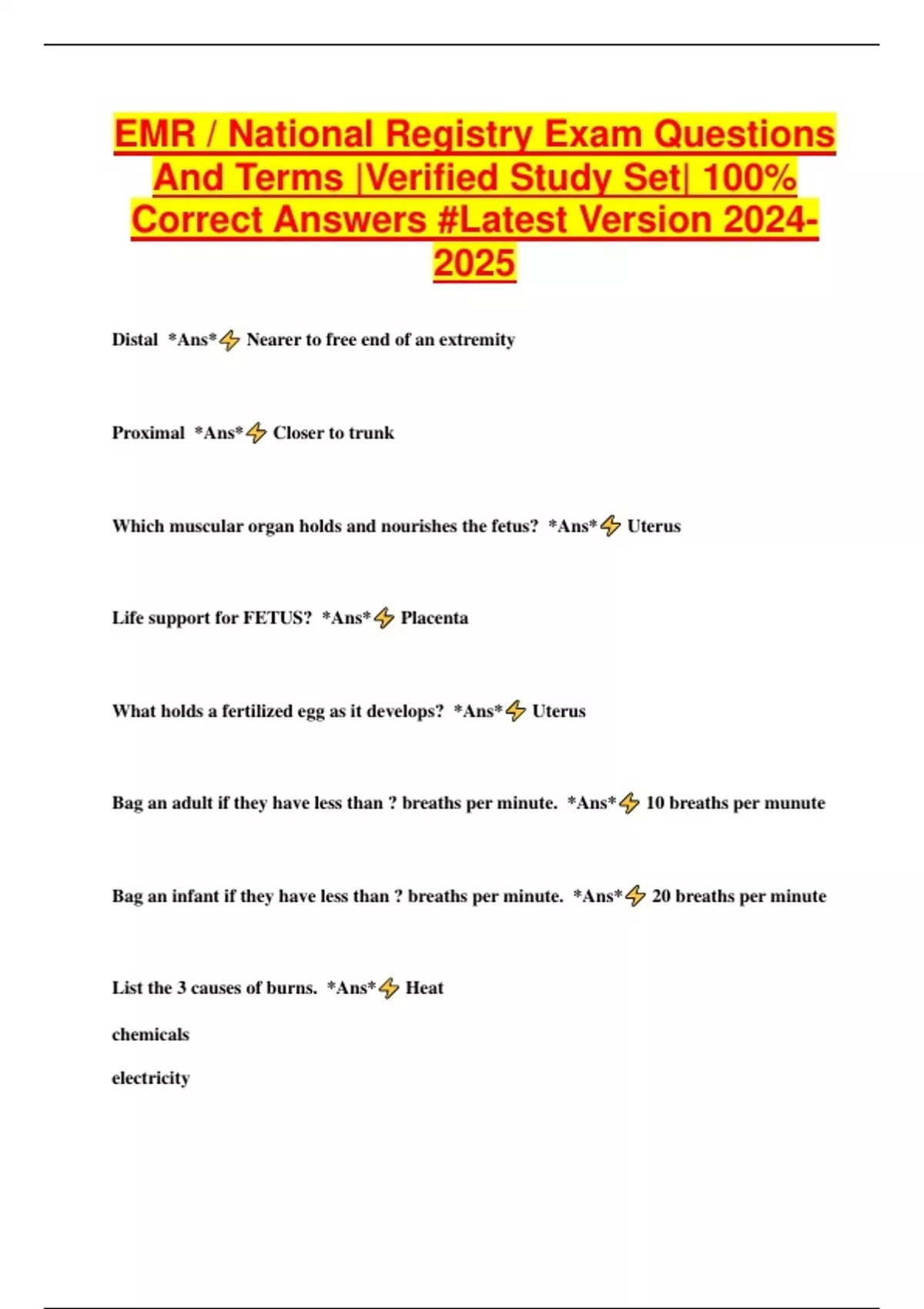 EMR / National Registry Exam Questions And Terms |Verified Study Set| 100% Correct Answers #Latest Version 2024- 2025 Distal *Ans* Nearer to free end of an extremity Proximal *Ans* Closer to trunk Which muscular organ holds and nourishes the fetus? *Ans* Uterus Life support for FETUS? *Ans* Placenta What holds a fertilized egg as it develops? *Ans* Uterus Bag an adult if they have less than ? breaths per minute. *Ans* 10 breaths per munute Bag an infant if they have less than ? breaths per minute. *Ans* 20 breaths per minute List the 3 causes of burns. *Ans* Heat chemicals electricity What is a 3rd degree burn? *Ans* Damages all layers of skin - full thickness burn What is a 2nd degree burn? *Ans* Partial thickness burn 3 types of splints? *Ans* Rigid Soft Traction splints 3 types of pipes?(blood vessels) *Ans* Arteries Veins Capillaries Sign or symptom of FLAIL CHEST? *Ans* One side of chest rises and falls when respirating and other doesnt. What can Flail chest cause? *Ans* Hypoxia: less oxygen and carbon dioxide exchanged in the lungs How to treat Flail chest? *Ans* Place a pillow on top of the side with the damaged ribs to help brace them as you continue to respirate. How long can you leave a tourniquet on a patient? *Ans* 2 hours How to treat a STROKE? *Ans* 1) airway 2) emotional support A mother in labor is having trouble breathing; what do you do? *Ans* Lay on left side in the Recovery Position What is active labor? *Ans* Contractions (starting at the beginning of the first contraction to the beginning of the second contraction) 2 minutes apart for 10 minutes. ?????????????????????????? Book says 3 minutes apart or less, baby is coming Where do you clamp the cord after baby is born? *Ans* Clamp cord 6" away from baby and then a second clamp another 6" away from the first clamp How soon does the placenta deliver? *Ans* 30 minutes What is an Ectopic Pregnancy? *Ans* Fertilized egg becomes implanted in Fallopian tune rather than in the uterus. Signs and symptoms of an ectopic pregnancy? *Ans* Sudden pain