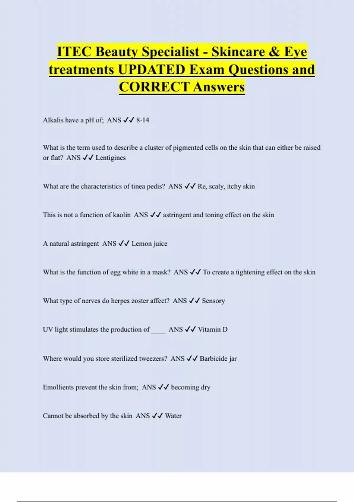 ITEC Beauty Specialist - Skincare & Eye treatments UPDATED Exam Questions and CORRECT Answers