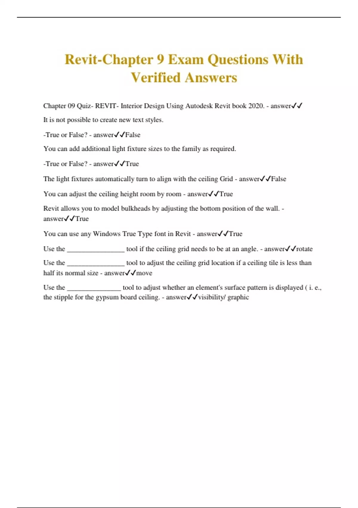 Revit-Chapter 9 Exam Questions With Verified Answers Chapter 09 Quiz- REVIT- Interior Design Using Autodesk Revit book 2020. - answer It is not possible to create new text styles. -True or False? - answerFalse You can add additional light fixture sizes to the family as required. -True or False? - answerTrue The light fixtures automatically turn to align with th