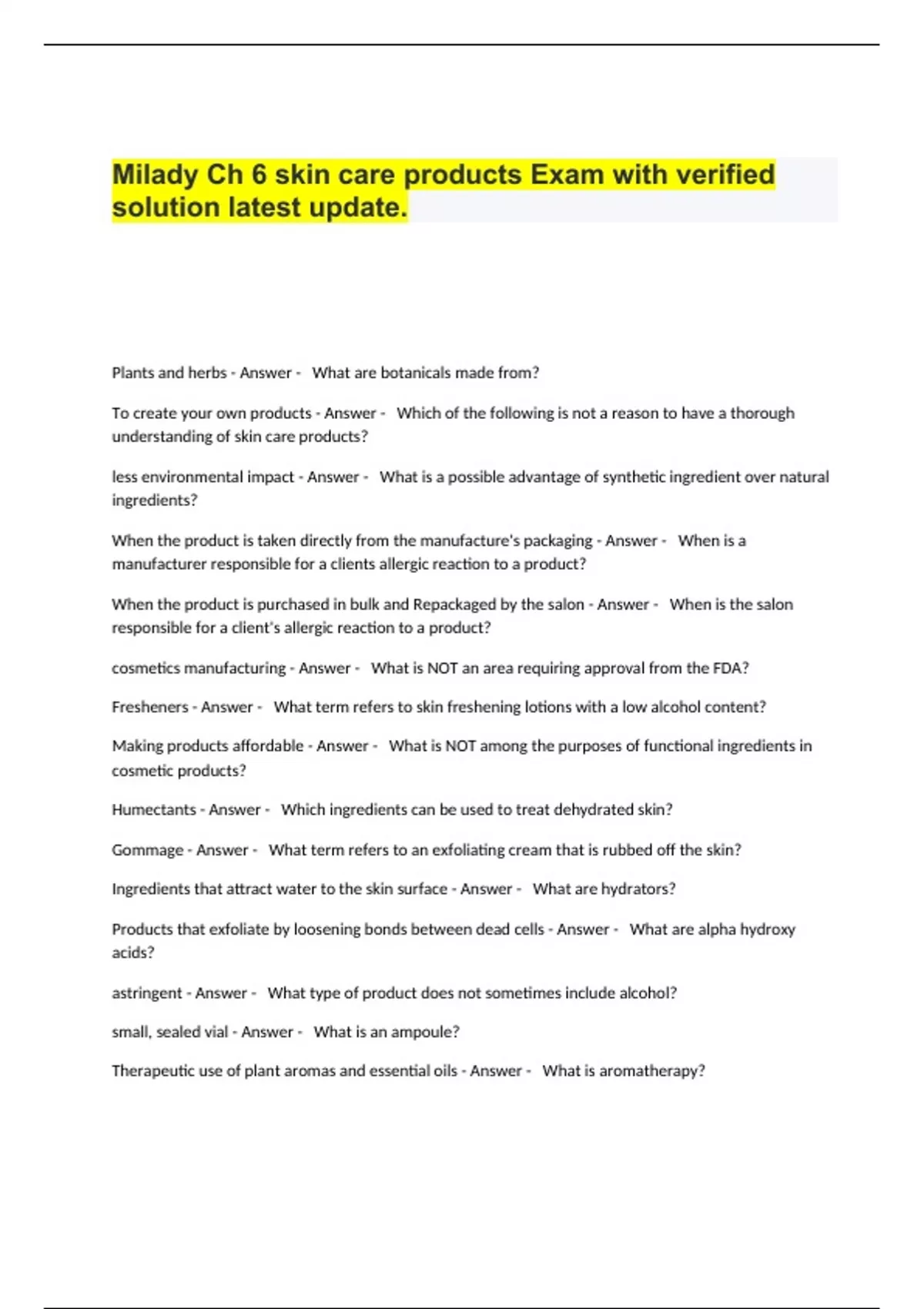 Milady Ch 6 skin care products Exam with verified solution latest update..