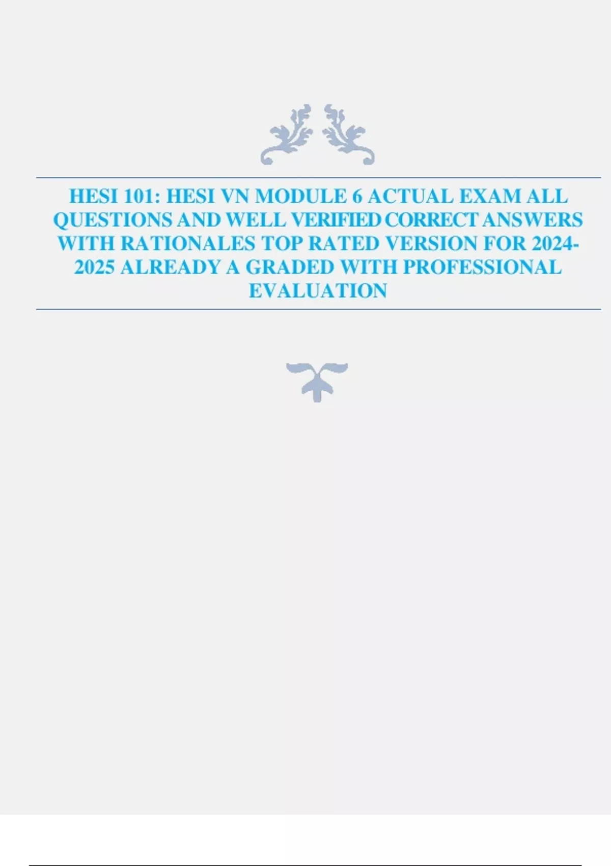 HESI 101: HESI VN MODULE 6 ACTUAL EXAM ALL QUESTIONS AND WELL VERIFIED CORRECT ANSWERS WITH RATIONALES TOP RATED VERSION FOR ALREADY A GRADED WITH PROFESSIONAL EVALUATION