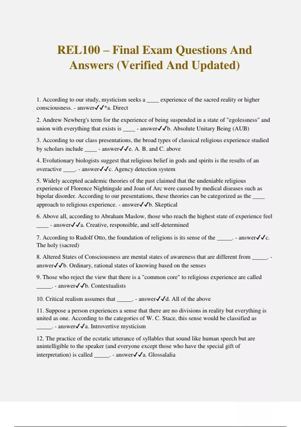 REL100 – Final Exam Questions And Answers (Verified And Updated) 1. According to our study, mysticism seeks a ____ experience of the sacred reality or higher consciousness. - answer*a. Direct 2. Andrew Newberg's term for the experience of being suspended in a state of "egolessness" and union with everything that exists is ____ - answerb. Absolute Unitary Being (AUB) 3. According to our class presentations, the broad types of classical religious experience studied by scholars include ____ - answere. A. B. and C. above 4. Evolutionary biologists suggest that religious belief in gods and spirits is the results of an overactive ____. - answerc. Agency detection system 5. Widely accepted academic theories of the past claimed that the undeniable religious experience of Florence Nightingale and Joan of Arc were caused by medical diseases such as bipolar disorder. According to our presentations, these theories can be categorized as the ____ approach to religious experience. - answerb. Skeptical 6. Above all, according to Abraham Maslow, those who reach the highest state of experience feel ____ - answera. Creative, responsible, and self-determined 7. According to Rudolf Otto, the foundation of religions is its sense of the _____. - answerc. The holy (sacred) 8. Altered States of Consciousness are mental states of awareness that are different from _____. - answerb. Ordinary, rational states of knowing based on the senses 9. Those who reject the view that there is a "common core" to religious experience are called _____. - answerb. Contextualists 10. Critical realism assumes that _____. - answerd. All of the above 11. Suppose a person experiences a sense that there are no divisions in reality but everything is united as one. According to the categories of W. C. Stace, this sense would be classified as _____. - answera. Introvertive mysticism 12. The practice of the ecstatic utterance of syllables that sound like human speech but are unintelligible to the speaker (and everyone except those who have the special gift of interpretation) is called _____. - answera. Glossalalia 13. According to Rudolf Otto, human persons feel ____ when they have religious experiences such as Moses did when he encountered God in the Burning Bush. - answere. A. and B. above 14. According to Abraham Maslow the highest state of human fulfillment is the ____. - answerc. Peak Experience 15. In Abraham Maslow's hierarchy of needs, is it possible to reach the highest level of human fulfillment if one has a basic sense of insecurity? - answerb. No 16. According to Yoga Master Pantañjali, the original state of the mind is in which there is no longer any divisions of distinctions in awareness. In English, this term is called _____. - answerd. Pure Consciousness 17. According to William James, the basis of religion is the sense of _____, - answerb. An invisible "Presence" that is known by intuition 18. According to Aldous Huxley, the "Perennial Consciousness" includes concepts of _____. - answere. A. and B. above 19. According to the categories of W. C. Stace, the basic type of mysticism in which the subjects of mystical experiences are united with a reality (such as God) that is still somewhat distitict from them is ____. - answera. Extrovertive mysticism 20. Contemporary cognitive science views the brain as _____. - answera. A system of systems of processing information 21. One way that cognitive scientists would explain the near universal appearance of religion in human society (whether primitive or modern) is that _____. - answerb. The capacity for religious experience is analogous to language 22. According to current studies of cognitive science, once the brain has fully developed in late adolescence, the structure and operations of the brain remain stable until they deteriorate in old age. - answerb. False 23. According to our presentations, currently cognitive scientists who study the question of brain and mind say that they cannot tell the difference between mechanism of the brain and mental states of consciousness - answera. True 24. According to the studies of cognitive scientist Sara Lazar, those who learn meditation and practice it regularly will _____. - answera. Show a thickening of the cerebral cortex of the brain 25. Andrew Newberg found that what he called the _____ area of the brain of Buddhist monks was especially active during meditation. - answera. Attention