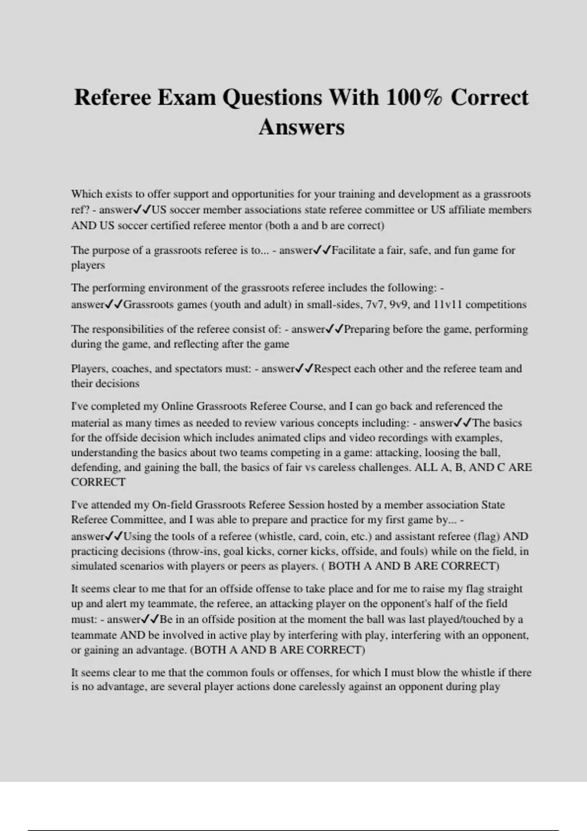 Referee Exam Questions With 100% Correct Answers Which exists to offer support and opportunities for your training and development as a grassroots ref? - answerUS soccer member associations state referee committee or US affiliate members AND US soccer certified referee mentor (both a and b are correct) The purpose of a grassroots referee is to... - answerFacilitate a fair, safe, and fun game for players The performing environment of the grassroots referee includes the following: - answerGrassroots games (youth and adult) in small-sides, 7v7, 9v9, and 11v11 competitions The responsibilities of the referee consist of: - answerPreparing before the game, performing during the game, and reflecting after the game Players, coaches, and spectators must: - answerRespect each other and the referee team and their decisions I've completed my Online Grassroots Referee Course, and I can go back and referenced the material as many times as needed to review various concepts including: - answerThe basics for the offside decision which includes animated clips and video recordings with examples, understanding the basics about two teams competing in a game: attacking, loosing the ball, defending, and gaining the ball, the basics of fair vs careless challenges. ALL A, B, AND C ARE CORRECT I've attended my On-field Grassroots Referee Session hosted by a member association State Referee Committee, and I was able to prepare and practice for my first game by... - answerUsing the tools of a referee (whistle, card, coin, etc.) and assistant referee (flag) AND practicing decisions (throw-ins, goal kicks, corner kicks, offside, and fouls) while on the field, in simulated scenarios with players or peers as players. ( BOTH A AND B ARE CORRECT) It seems clear to me that for an offside offense to take place and for me to raise my flag straight up and alert my teammate, the referee, an attacking player on the opponent's half of the field must: - answerBe in an offside position at the moment the ball was last played/touched by a teammate AND be involved in active play by interfering with play, interfering with an opponent, or gaining an advantage. (BOTH A AND B ARE CORRECT) It seems clear to me that the common fouls or offenses, for which I must blow the whistle if there is no advantage, are several player actions done carelessly against an opponent during play