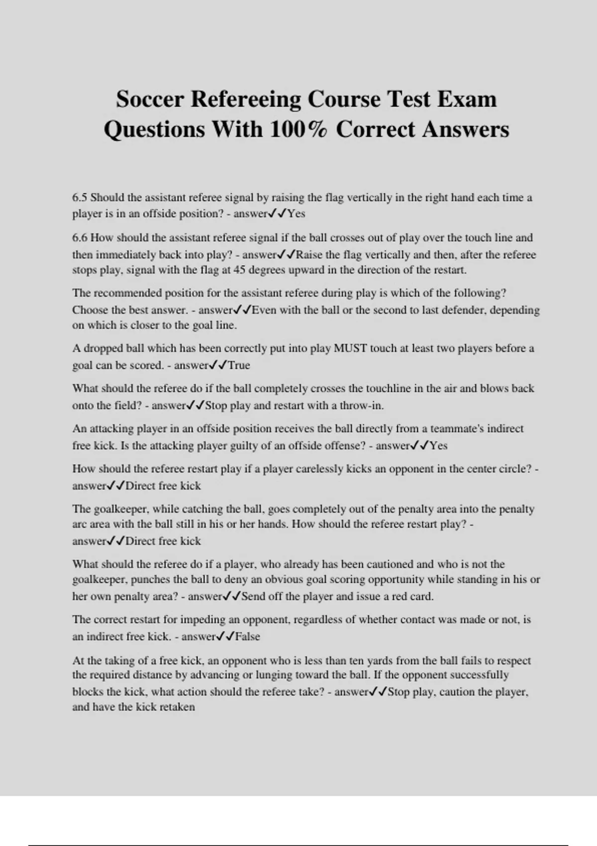 Soccer Refereeing Course Test Exam Questions With 100% Correct Answers 6.5 Should the assistant referee signal by raising the flag vertically in the right hand each time a player is in an offside position? - answerYes 6.6 How should the assistant referee signal if the ball crosses out of play over the touch line and then immediately back into play? - answerRaise the flag vertically and then, after the referee stops play, signal with the flag at 45 degrees upward in the direction of the restart. The recommended position for the assistant referee during play is which of the following? Choose the best answer. - answerEven with the ball or the second to last defender, depending on which is closer to the goal line. A dropped ball which has been correctly put into play MUST touch at least two players before a goal can be scored. - answerTrue What should the referee do if the ball completely crosses the touchline in the air and blows back onto the field? - answerStop play and restart with a throw-in. An attacking player in an offside position receives the ball directly from a teammate's indirect free kick. Is the attacking player guilty of an offside offense? - answerYes How should the referee restart play if a player carelessly kicks an opponent in the center circle? - answerDirect free kick The goalkeeper, while catching the ball, goes completely out of the penalty area into the penalty arc area with the ball still in his or her hands. How should the referee restart play? - answerDirect free kick What should the referee do if a player, who already has been cautioned and who is not the goalkeeper, punches the ball to deny an obvious goal scoring opportunity while standing in his or her own penalty area? - answerSend off the player and issue a red card. The correct restart for impeding an opponent, regardless of whether contact was made or not, is an indirect free kick. - answerFalse At the taking of a free kick, an opponent who is less than ten yards from the ball fails to respect the required distance by advancing or lunging toward the ball. If the opponent successfully blocks the kick, what action should the referee take? - answerStop play, caution the player, and have the kick retaken