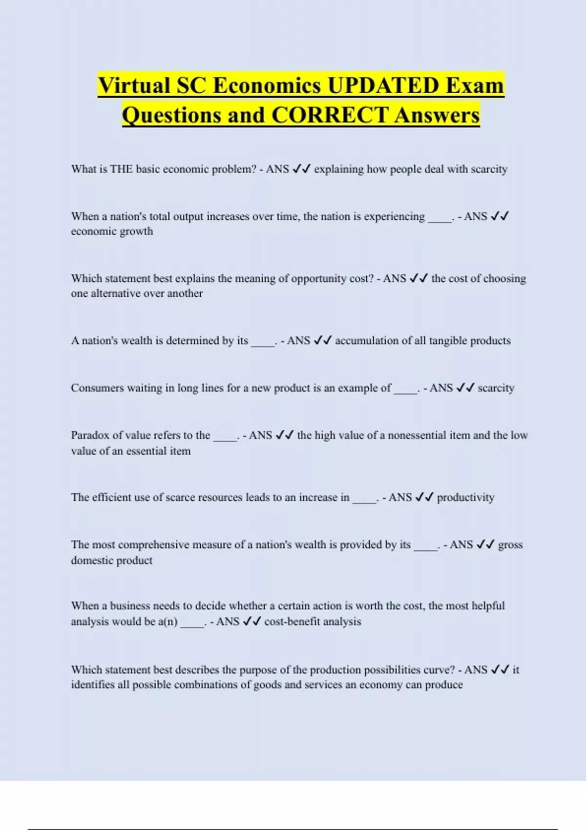 What is THE basic economic problem? - ANS explaining how people deal with scarcity When a nation's total output increases over time, the nation is experiencing ____. - ANS economic growth Which statement best explains the meaning of opportunity cost? - ANS the cost of choosing one alternative over another A nation's wealth is determined by its ____. - ANS accumulation of all tangible products Consumers waiting in long lines for a new product is an example of ____. - ANS scarcity