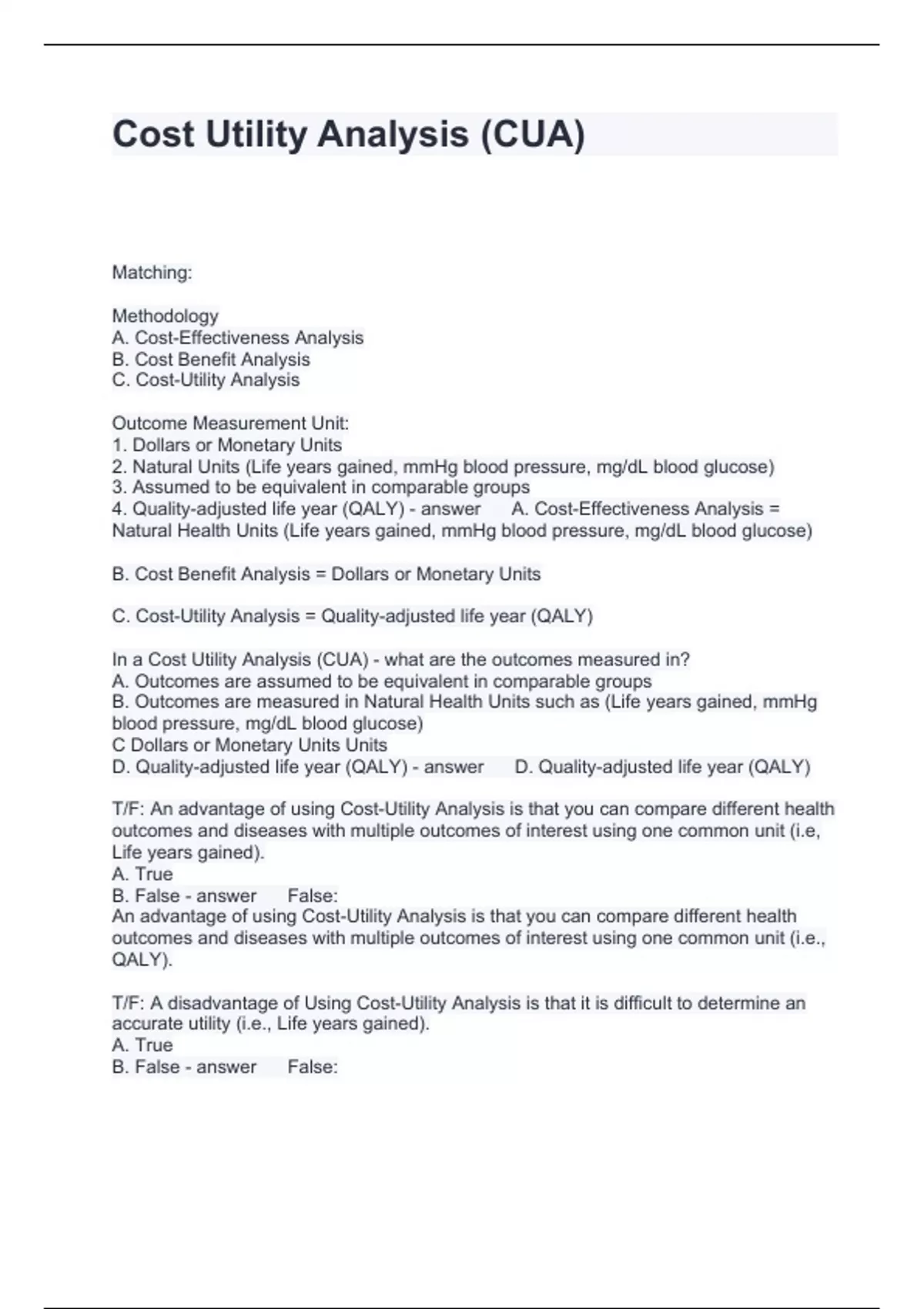 Cost Utility Analysis (CUA) Questions with complete Answers 2024