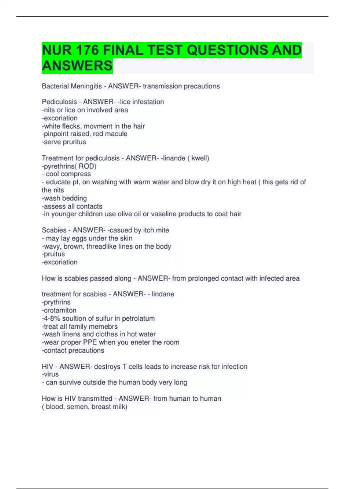 NUR 176 FINAL TEST QUESTIONS AND ANSWERS Bacterial Meningitis - ANSWER- transmission precautions Pediculosis - ANSWER- -lice infestation -nits or lice on involved area -excoriation -white flecks, movment in the hair -pinpoint raised, red macule -serve pruritus Treatment for pediculosis - ANSWER- -linande ( kwell) -pyrethrins( ROD) - cool compress - educate pt, on washing with warm water and blow dry it on high heat ( this gets rid of the nits -wash bedding -assess all contacts -in younger children use olive oil or vaseline products to coat hair Scabies - ANSWER- -casued by itch mite - may lay eggs under the skin -wavy, brown, threadlike lines on the body -pruitus -excoriation How is scabies passed along - ANSWER- from prolonged contact with infected area treatment for scabies - ANSWER- - lindane -prythrins -crotamiton -4-8% soultion of sulfur in petrolatum -treat all family memebrs -wash linens and clothes in hot water -wear proper PPE when you eneter the room -contact precautions HIV - ANSWER- destroys T cells leads to increase risk for infection -virus - can survive outside the human body very long How is HIV transmitted - ANSWER- from human to human ( blood, semen, breast milk) HIV antibody testing - ANSWER- ELISA detects presence of HIV antibodies - if positive ELISA done a second time -western blot is done when second ELISA is +, this is more sensitive than ELISA Therapeutic management for HIV - ANSWER- monitoring HIV diease progression and immune function - preventing opportunistics dieases and treating it -managing symptoms -initiating and monitoring antiretroviral thearpy -using multi drug therapy to prevent the virus from becoming resistant -when it is hard to swallow b/c of white patches in the mouth- increase fluids use a straw - it take up to 18 months for a new born baby to develpoe symptoms of HUV - high cal. high potassium, high cal Kaposi sarcoma (KS) - ANSWER- - blue, red, purple rasied areas lesions in the skin need to be reported to the RN right away -slow growing Kaposi sarcoma develops in people who - ANSWER- are infected with HIV= diagnostic testing CD4+ count and viral load Glucophage (metformin) - ANSWER- -oral diabetes medicine that helps control blood sugar levels