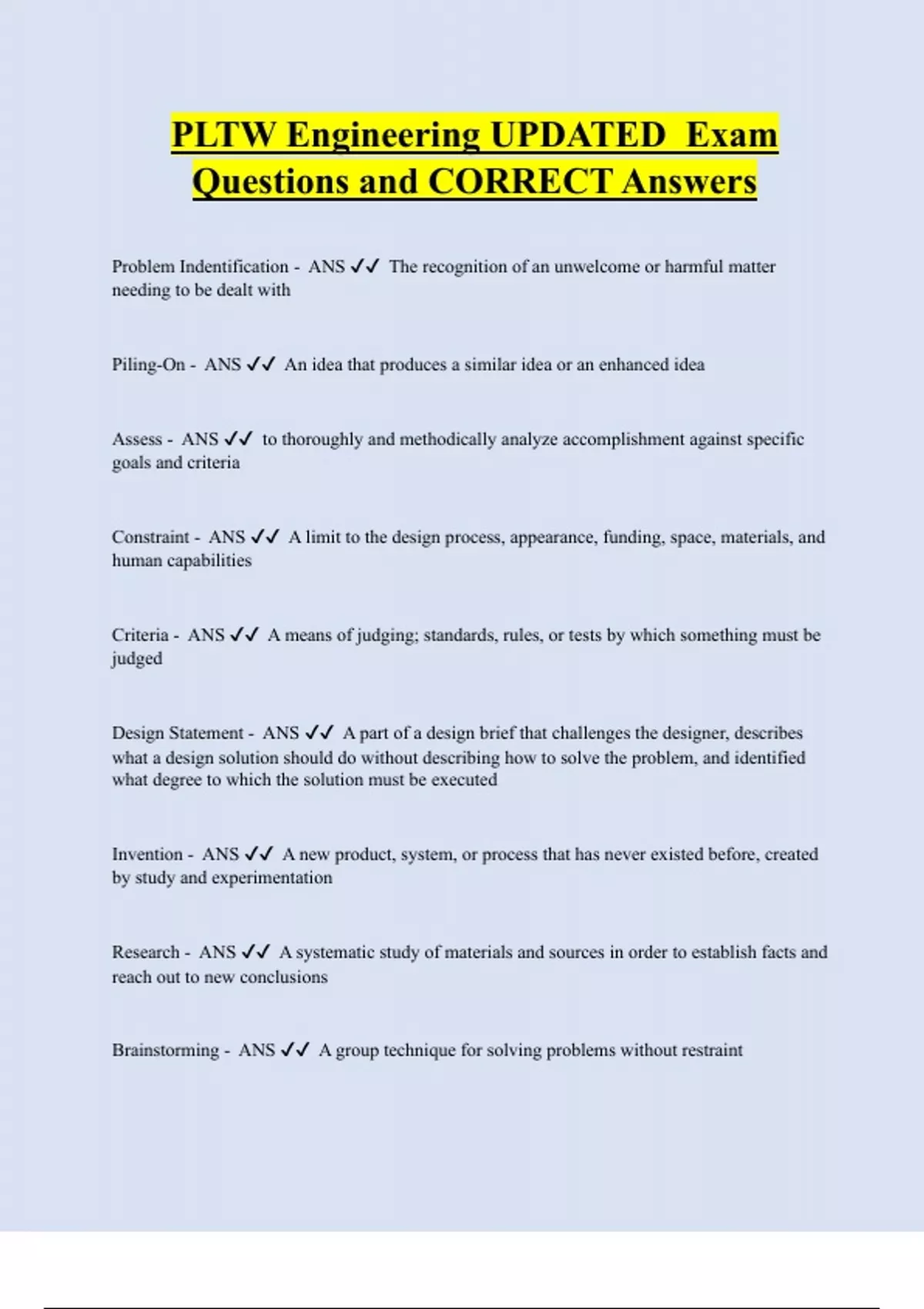 PLTW Engineering UPDATED Exam Questions and CORRECT Answer