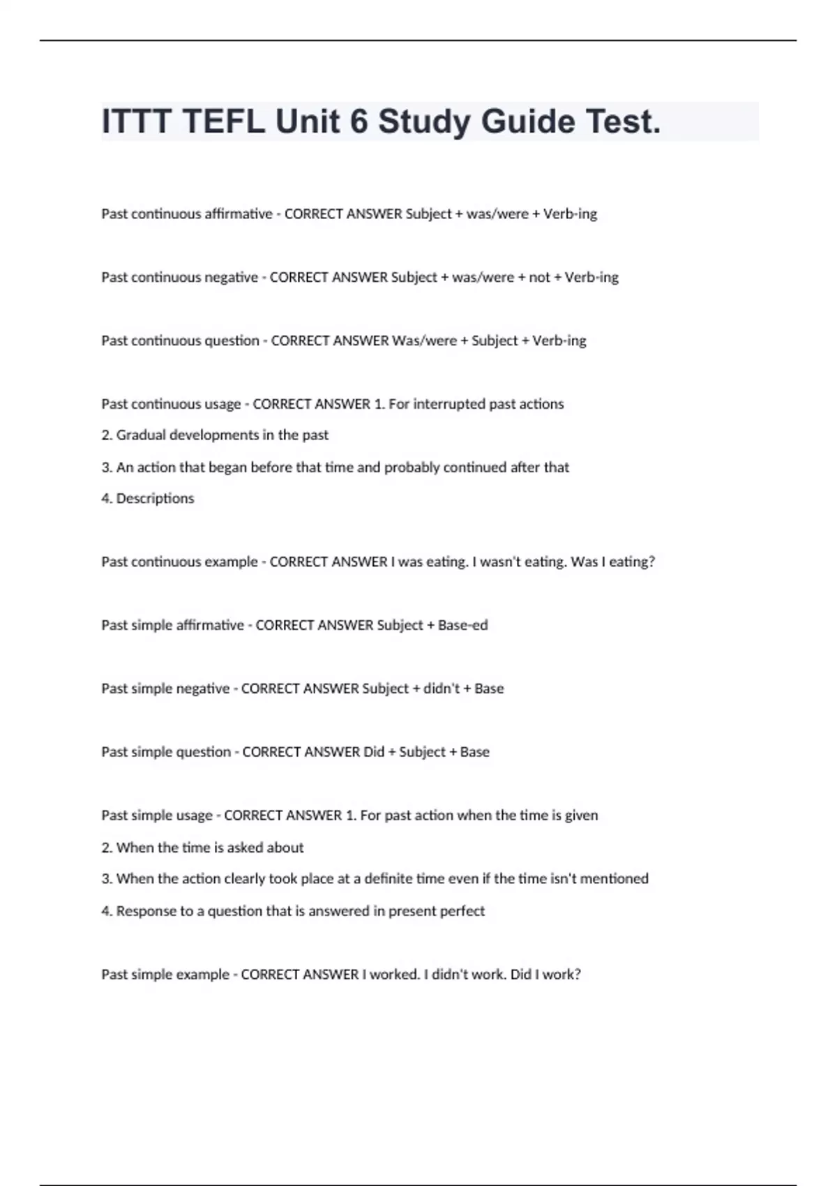 ITTT TEFL Unit 6 Study Guide Test. Past continuous affirmative - CORRECT ANSWER Subject + was/were + Verb-ing Past continuous negative - CORRECT ANSWER Subject + was/were + not + Verb-ing Past continuous question - CORRECT ANSWER Was/were + Subject + Verb-ing Past continuous usage - CORRECT ANSWER 1. For interrupted past actions 2. Gradual developments in the past 3. An action that began before that time and probably continued after that 4. Descriptions Past continuous example - CORRECT ANSWER I was eating. I wasn't eating. Was I eating? Past simple affirmative - CORRECT ANSWER Subject + Base-ed Past simple negative - CORRECT ANSWER Subject + didn't + Base Past simple question - CORRECT ANSWER Did + Subject + Base Past simple usage - CORRECT ANSWER 1. For past action when the time is given 2. When the time is asked about 3. When the action clearly took place at a definite time even if the time isn't mentioned 4. Response to a question that is answered in present perfect