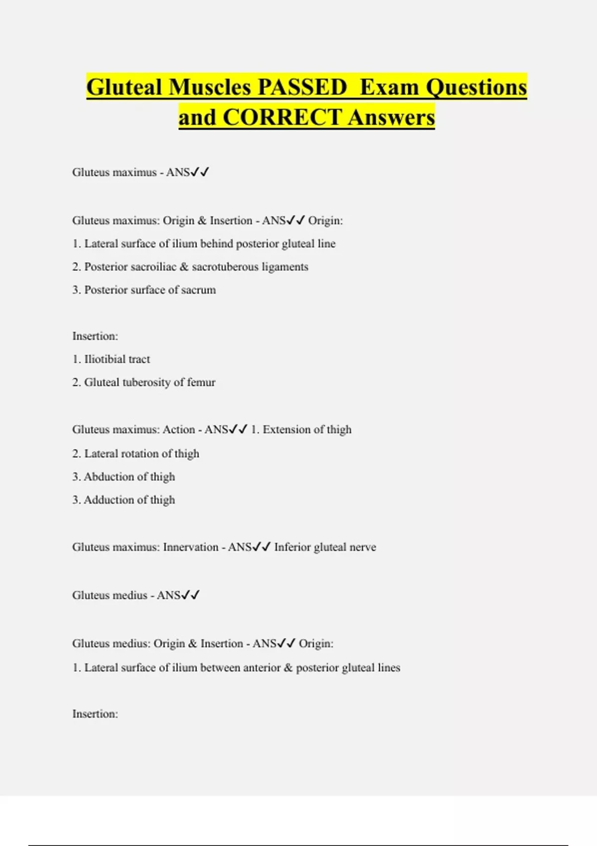 Gluteal Muscles PASSED Exam Questions and CORRECT Answers