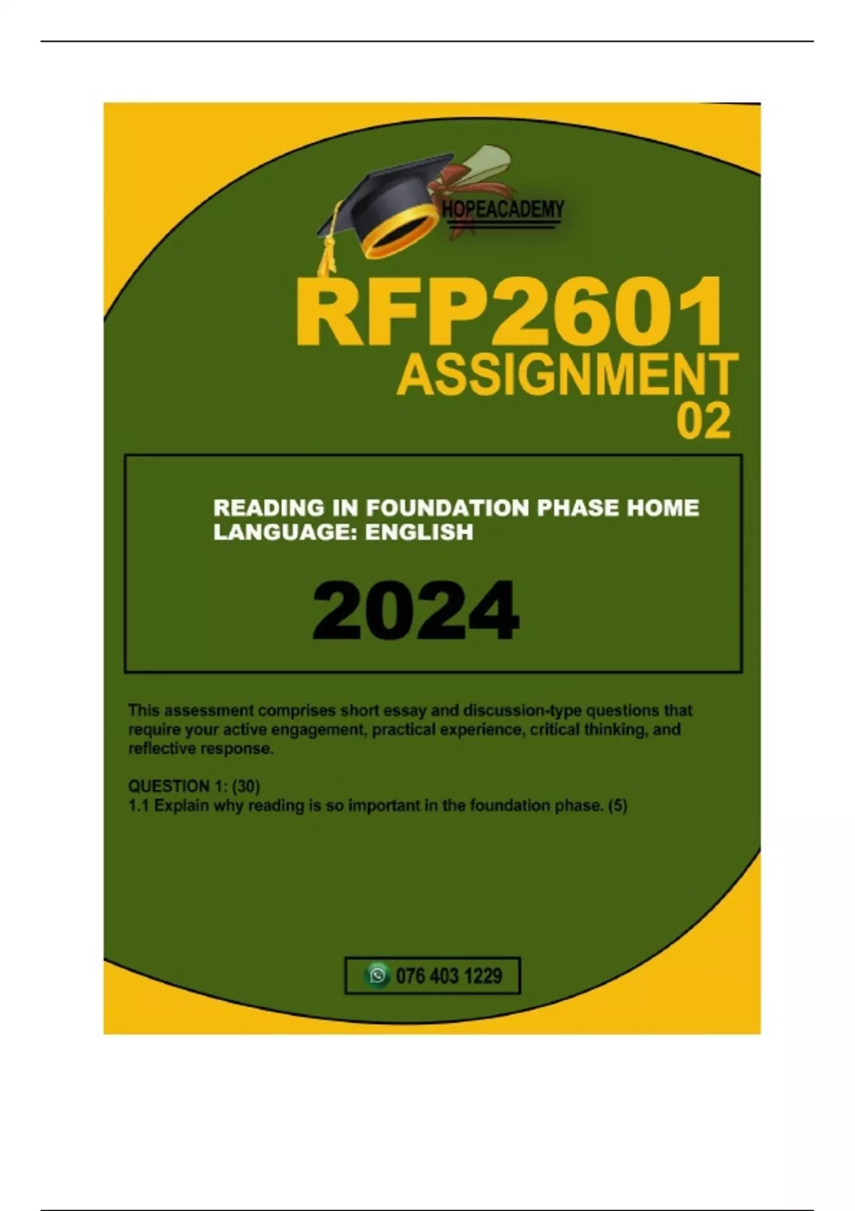 RFP2601 ASSIGNMENT 02...DUE DATE 2024 1.1Explain why reading is so important in the foundation phase. (5)