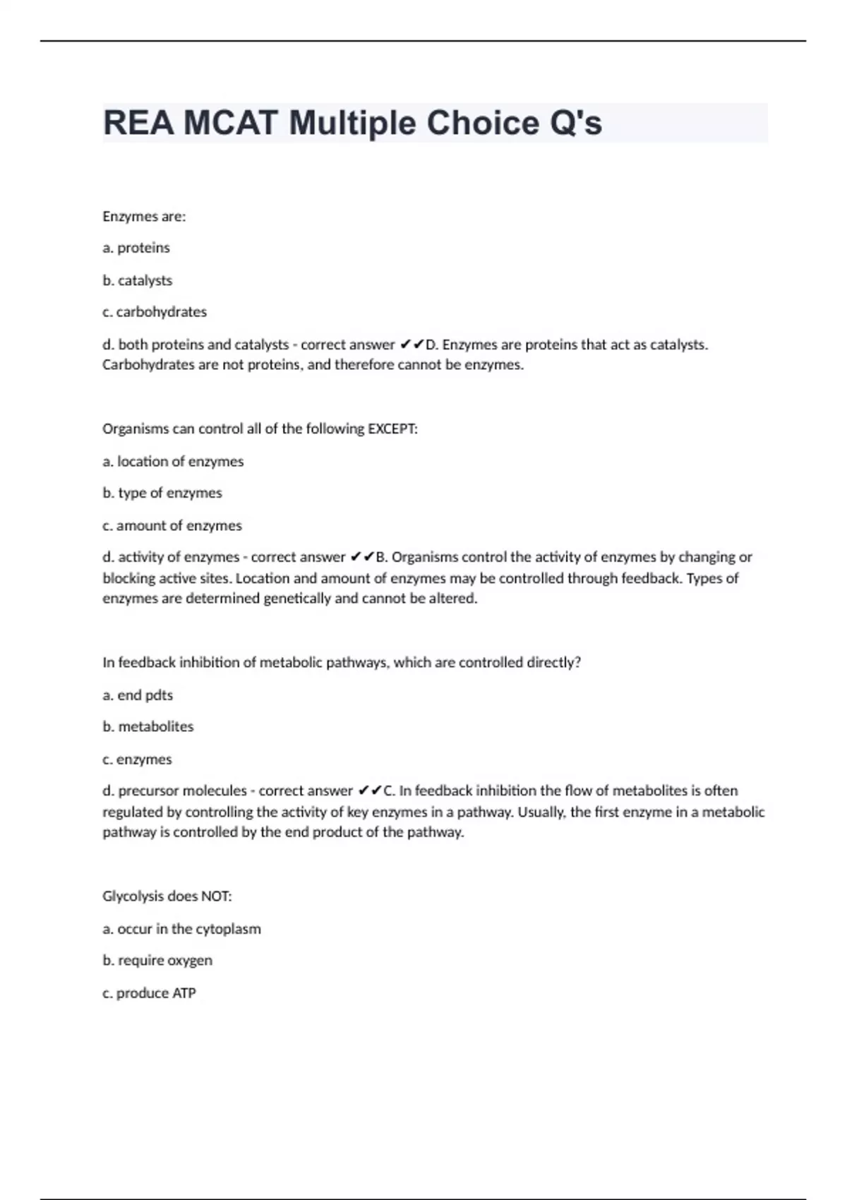 REA MCAT Multiple Choice Q'sEnzymes are: a. proteins b. catalysts c. carbohydrates d. both proteins and catalysts - correct answer D. Enzymes are proteins that act as catalysts. Carbohydrates are not proteins, and therefore cannot be enzymes. Organisms can control all of the following EXCEPT: a. location of enzymes b. type of enzymes c. amount of enzymes d. activity of enzymes - correct answer B. Organisms control the activity of enzymes by changing or blocking active sites. Location and amount of enzymes may be controlled through feedback. Types of enzymes are determined genetically and cannot be altered. In feedback inhibition of metabolic pathways, which are controlled directly? a. end pdts b. metabolites c. enzymes d. precursor molecules - correct answer C. In feedback inhibition the flow of metabolites is often regulated by controlling the activity of key enzymes in a pathway. Usually, the first enzyme in a metabolic pathway is controlled by the end product of the pathway. Glycolysis does NOT: a. occur in the cytoplasm b. require oxygen c. produce ATP
