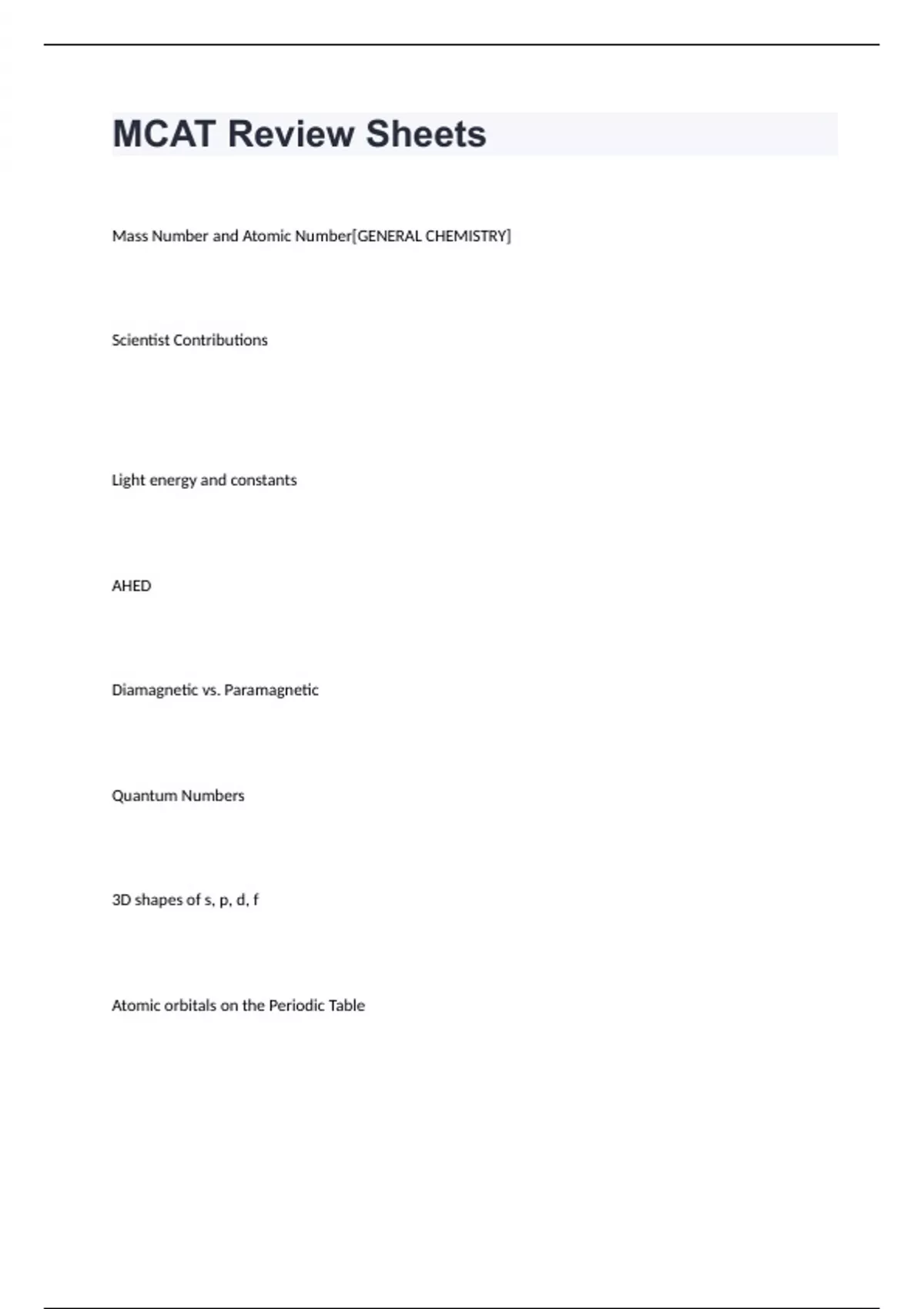 MCAT Review SheetsMass Number and Atomic Number[GENERAL CHEMISTRY] Scientist Contributions Light energy and constants AHED Diamagnetic vs. Paramagnetic Quantum Numbers 3D shapes of s, p, d, f Atomic orbitals on the Periodic Table