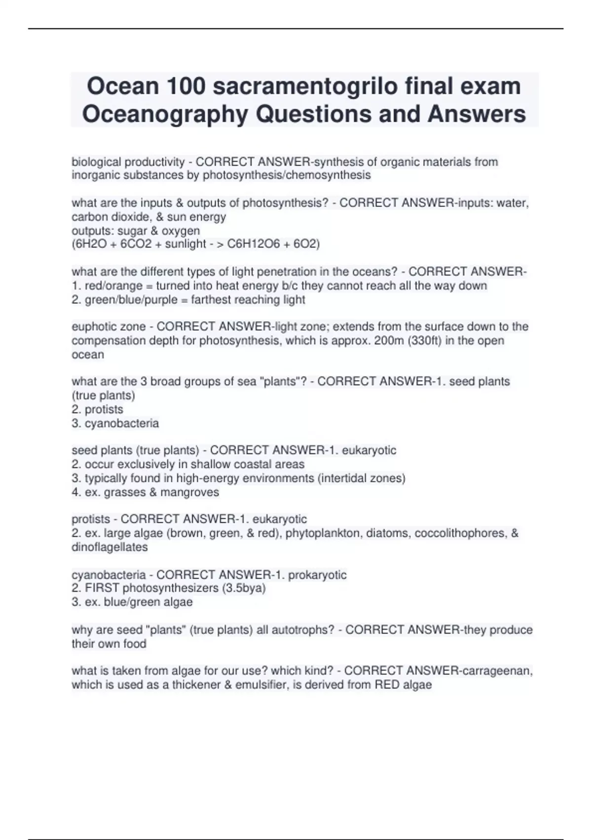 Ocean 100 sacramentogrilo final exam Oceanography Questions and Answers biological productivity - CORRECT ANSWER-synthesis of organic materials from inorganic substances by photosynthesis/chemosynthesis what are the inputs & outputs of photosynthesis? - CORRECT ANSWER-inputs: water, carbon dioxide, & sun energy outputs: sugar & oxygen (6H2O + 6CO2 + sunlight - > C6H12O6 + 6O2) what are the different types of light penetration in the oceans? - CORRECT ANSWER1. red/orange = turned into heat energy b/c they cannot reach all the way down 2. green/blue/purple = farthest reaching light euphotic zone - CORRECT ANSWER-light zone; extends from the surface down to the compensation depth for photosynthesis, which is approx. 200m (330ft) in the open ocean what are the 3 broad groups of sea "plants"? - CORRECT ANSWER-1. seed plants (true plants) 2. protists 3. cyanobacteria seed plants (true plants) - CORRECT ANSWER-1. eukaryotic 2. occur exclusively in shallow coastal areas 3. typically found in high-energy environments (intertidal zones) 4. ex. grasses & mangroves protists - CORRECT ANSWER-1. eukaryotic 2. ex. large algae (brown, green, & red), phytoplankton, diatoms, coccolithophores, & dinoflagellates cyanobacteria - CORRECT ANSWER-1. prokaryotic 2. FIRST photosynthesizers (3.5bya) 3. ex. blue/green algae why are seed "plants" (true plants) all autotrophs? - CORRECT ANSWER-they produce their own food what is taken from algae for our use? which kind? - CORRECT ANSWER-carrageenan, which is used as a thickener & emulsifier, is derived from RED algae