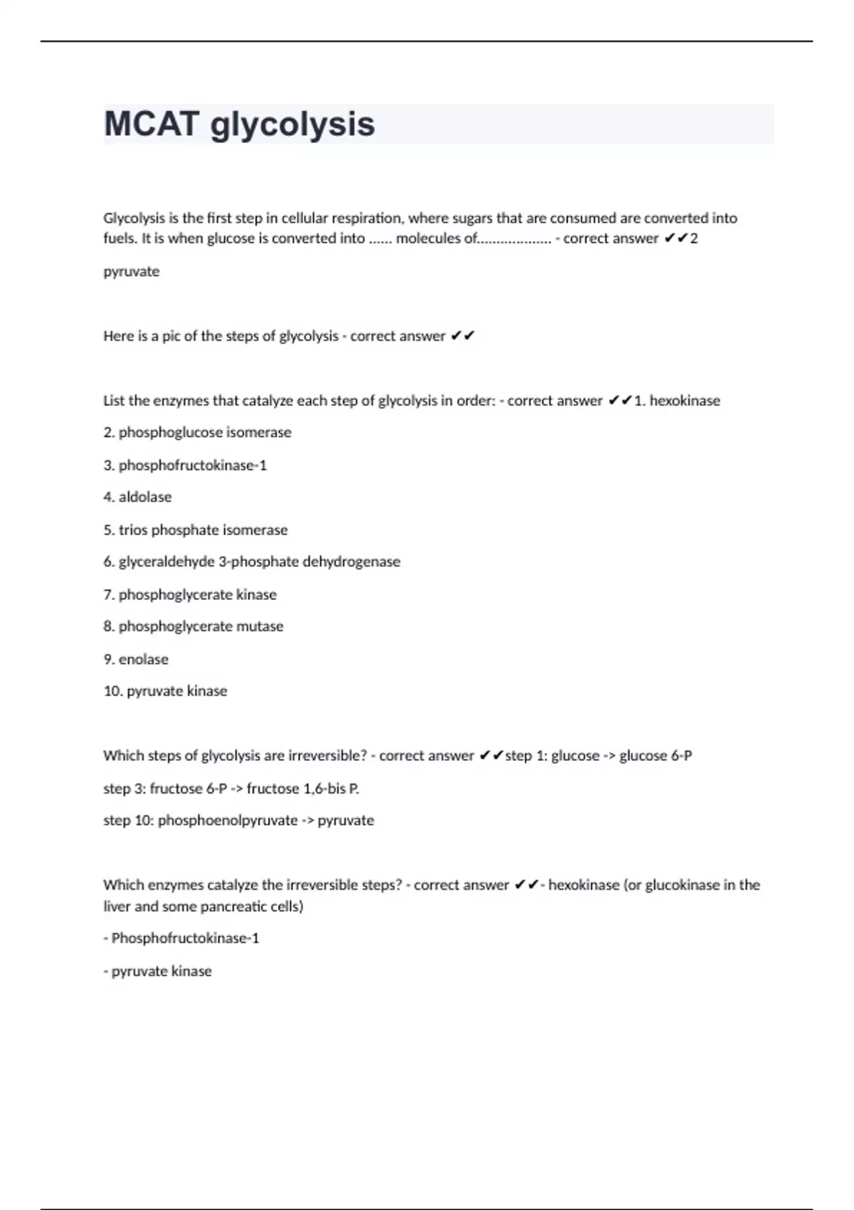 MCAT glycolysisGlycolysis is the first step in cellular respiration, where sugars that are consumed are converted into fuels. It is when glucose is converted into ...... molecules of................... - correct answer 2 pyruvate Here is a pic of the steps of glycolysis - correct answer List the enzymes that catalyze each step of glycolysis in order: - correct answer 1. hexokinase 2. phosphoglucose isomerase 3. phosphofructokinase-1 4. aldolase 5. trios phosphate isomerase 6. glyceraldehyde 3-phosphate dehydrogenase 7. phosphoglycerate kinase 8. phosphoglycerate mutase 9. enolase 10. pyruvate kinase Which steps of glycolysis are irreversible? - correct answer step 1: glucose -> glucose 6-P step 3: fructose 6-P -> fructose 1,6-bis P. step 10: phosphoenolpyruvate -> pyruvate Which enzymes catalyze the irreversible steps? - correct answer - hexokinase (or glucokinase in the liver and some pancreatic cells) - Phosphofructokinase-1 - pyruvate kinase