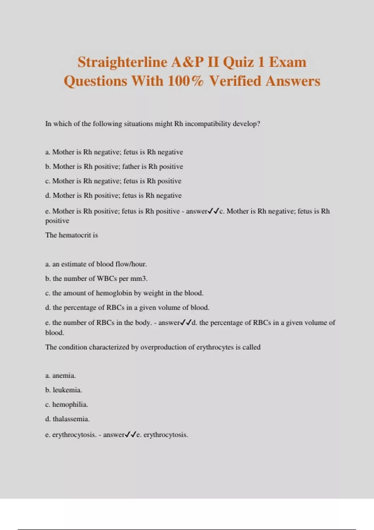 Straighterline A&P II Quiz 1 Exam Questions With 100% Verified Answers In which of the following situations might Rh incompatibility develop? a. Mother is Rh negative; fetus is Rh negative b. Mother is Rh positive; father is Rh positive c. Mother is Rh negative; fetus is Rh positive d. Mother is Rh positive; fetus is Rh negative e. Mother is Rh positive; fetus is Rh positive - answerc. Mother is Rh negative; fetus is Rh positive The hematocrit is a. an estimate of blood flow/hour. b. the number of WBCs per mm3. c. the amount of hemoglobin by weight in the blood. d. the percentage of RBCs in a given volume of blood. e. the number of RBCs in the body. - answerd. the percentage of RBCs in a given volume of blood. The condition characterized by overproduction of erythrocytes is called a. anemia. b. leukemia. c. hemophilia. d. thalassemia. e. erythrocytosis. - answere. erythrocytosis.