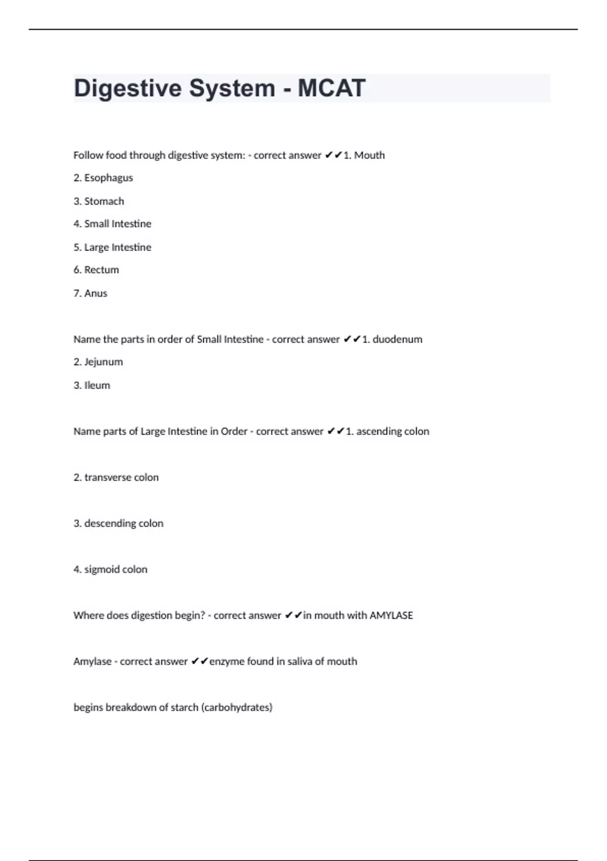 Digestive System - MCATFollow food through digestive system: - correct answer 1. Mouth 2. Esophagus 3. Stomach 4. Small Intestine 5. Large Intestine 6. Rectum 7. Anus Name the parts in order of Small Intestine - correct answer 1. duodenum 2. Jejunum 3. Ileum Name parts of Large Intestine in Order - correct answer 1. ascending colon 2. transverse colon 3. descending colon 4. sigmoid colon Where does digestion begin? - correct answer in mouth with AMYLASE Amylase - correct answer enzyme found in saliva of mouth begins breakdown of starch (carbohydrates)