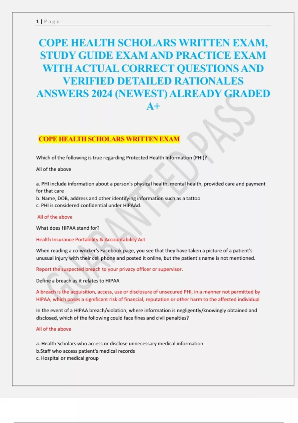 COPE HEALTH SCHOLARS WRITTEN EXAM, STUDY GUIDE EXAM AND PRACTICE EXAM WITH ACTUAL CORRECT QUESTIONS AND VERIFIED DETAILED RATIONALES ANSWERS 2024 (NEWEST) ALREADY GRADED A+