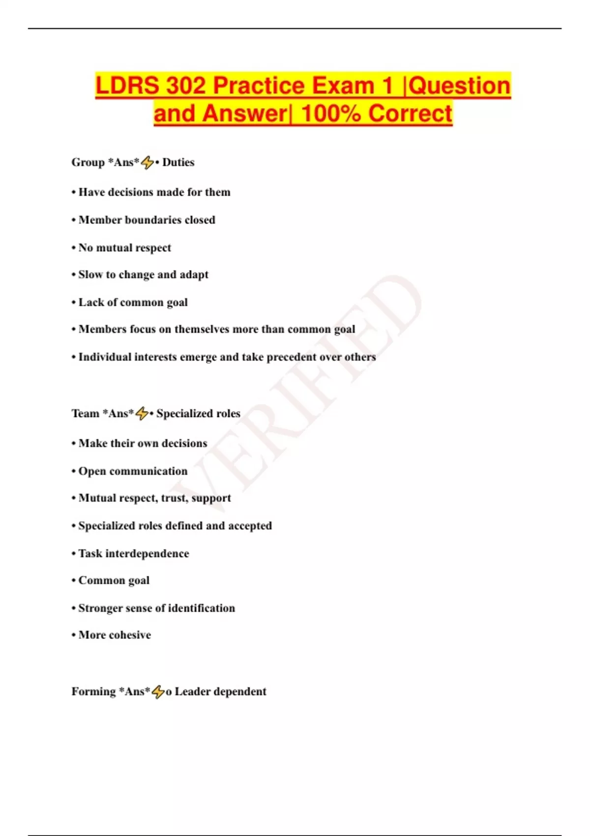 LDRS 302 Practice Exam 1 |Question and Answer| 100% Correct Group *Ans* • Duties • Have decisions made for them • Member boundaries closed • No mutual respect • Slow to change and adapt • Lack of common goal • Members focus on themselves more than common goal • Individual interests emerge and take precedent over others Team *Ans* • Specialized roles • Make their own decisions • Open communication • Mutual respect, trust, support • Specialized roles defined and accepted • Task interdependence • Common goal • Stronger sense of identification • More cohesive Forming *Ans* o Leader dependent o "get to know you" stage o Polite, guarded comments o Mixture of enthusiasm and skepticism o Little trust o Unfocused or task-related discussions o High enthusiasm, high effort, low frustration, low results Storming *Ans* o Intra-group conflict occurs o Jockey for position o Mostly task-related interactions o Individual needs emerging o Struggle for control, leadership o Enthusiasm drops, high effort, high frustration, low results o **Groups move to teams upon successful completion of this stag