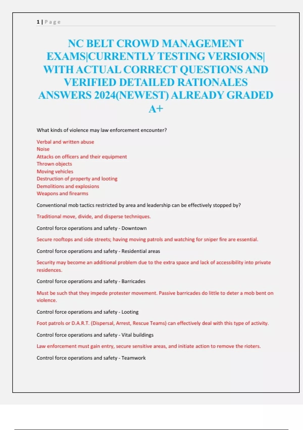 NC BELT CROWD MANAGEMENT EXAMS|CURRENTLY TESTING VERSIONS| WITH ACTUAL CORRECT QUESTIONS AND VERIFIED DETAILED RATIONALES ANSWERS 2024(NEWEST) ALREADY GRADED A+