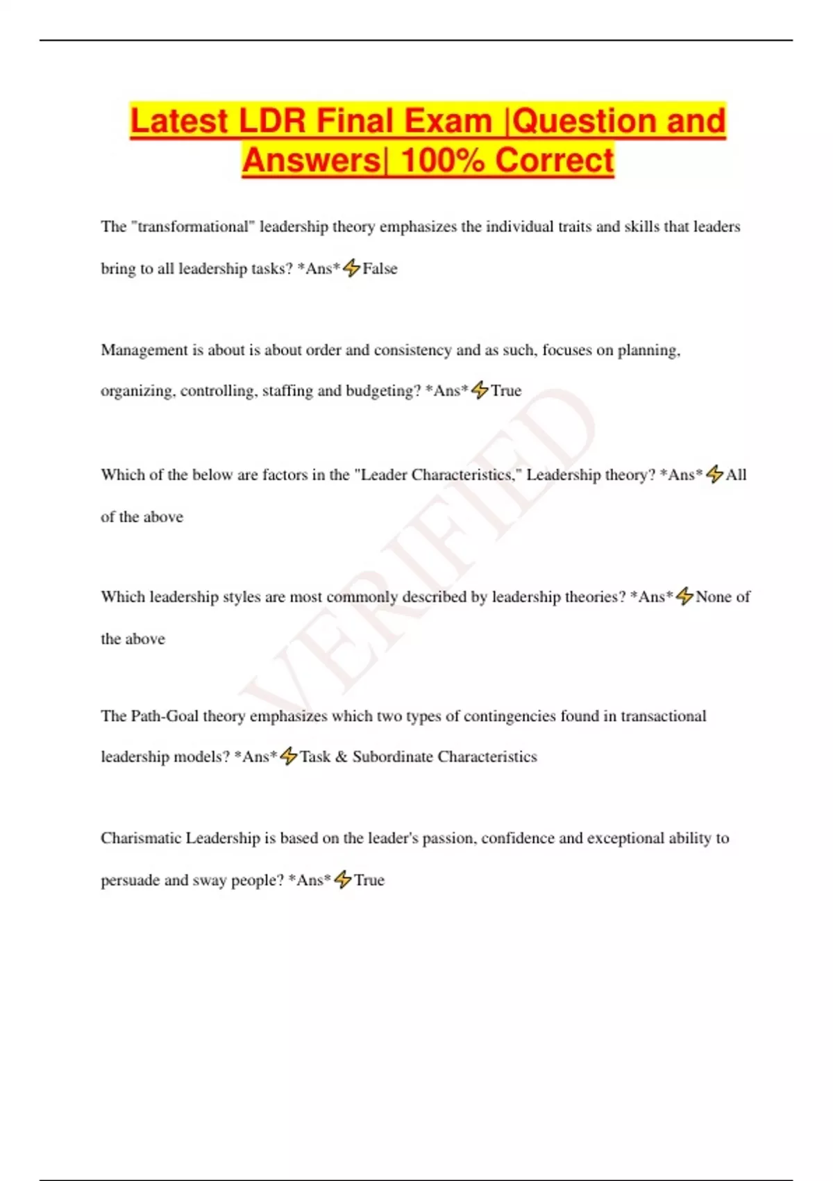 Latest LDR Final Exam |Question and Answers| 100% Correct The "transformational" leadership theory emphasizes the individual traits and skills that leaders bring to all leadership tasks? *Ans* False Management is about is about order and consistency and as such, focuses on planning, organizing, controlling, staffing and budgeting? *Ans* True Which of the below are factors in the "Leader Characteristics," Leadership theory? *Ans* All of the above Which leadership styles are most commonly described by leadership theories? *Ans* None of the above The Path-Goal theory emphasizes which two types of contingencies found in transactional leadership models? *Ans* Task & Subordinate Characteristics Charismatic Leadership is based on the leader's passion, confidence and exceptional ability to persuade and sway people? *Ans* True The transformational leader must change organizations and people in the following three successive stages? *Ans* All of the above Laissez-Faire leadership involves the leader being very "hands-on" in the organization's operations? *Ans* False Management-by-Exception is a style that utilizes mistakes or deviations from standards? *Ans* True Transactional leaders rarely rely on certain types of power (legitimate, reward and punishment)? *Ans* False Distributed leadership emphasizes the sharing of functions through empowerment mechanisms such as participation and delegation? *Ans* True Which of the following is NOT an example of Distributed Leadership? *Ans* Laissez-Faire Informal leaders can be participants, activists or diehards, depending on their ability to influence their colleagues? *Ans* True Self Leadership is the process of influencing oneself? *Ans* True