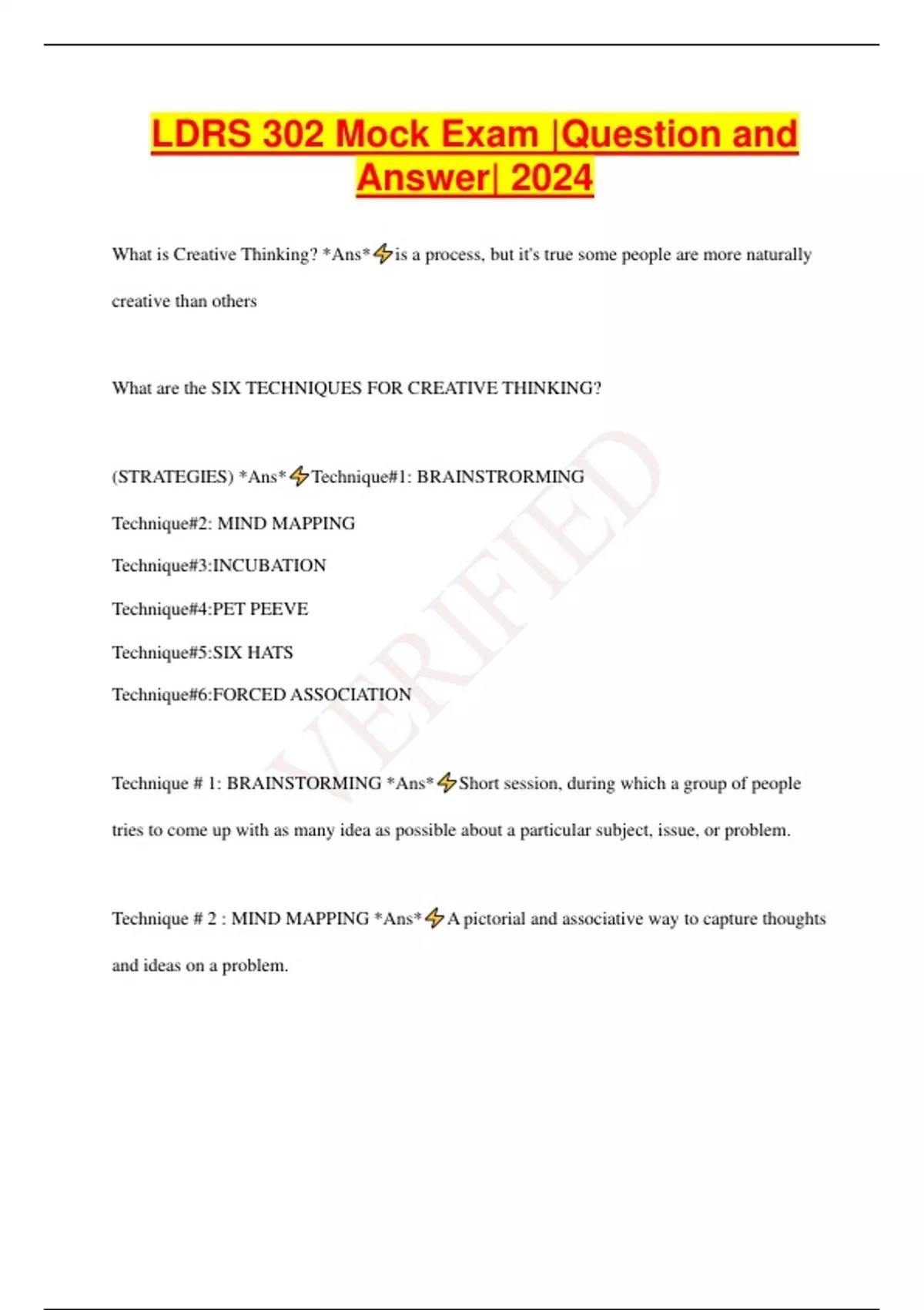 LDRS 302 Mock Exam |Question and Answer| 2024 What is Creative Thinking? *Ans* is a process, but it's true some people are more naturally creative than others What are the SIX TECHNIQUES FOR CREATIVE THINKING? (STRATEGIES) *Ans* Technique#1: BRAINSTRORMING Technique#2: MIND MAPPING Technique#3:INCUBATION Technique#4:PET PEEVE Technique#5:SIX HATS Technique#6:FORCED ASSOCIATION Technique # 1: BRAINSTORMING *Ans* Short session, during which a group of people tries to come up with as many idea as possible about a particular subject, issue, or problem. Technique # 2 : MIND MAPPING *Ans* A pictorial and associative way to capture thoughts and ideas on a problem. Technique # 3 : INCUBATION *Ans* Commonly, the second step in the creative process. Allows your subconscious to work on the problem. Also known as the mental break stage "SLEEP ON IT" Technique # 4: PET PEEVE *Ans* Group identifies all the possible complaints other might have about the groups organizational unit. "Try to focus on the problem, without worrying about the solution." Technique # 5: SIX HATS *Ans* Group takes turns wearing one of six metaphorical hats: -FACTS -EMOTIONS -JUDGMENT/CAUTION -LOGIC -CREATIVITY -CONTROL Technique # 6: FORCED ASSOCIATION *Ans* -Members of the group identify association between things -Somebody starts off with two ideas, props, concepts, or problems -People take turns identifying an association between the items -Keep going until you're exhausted and then pick something else.