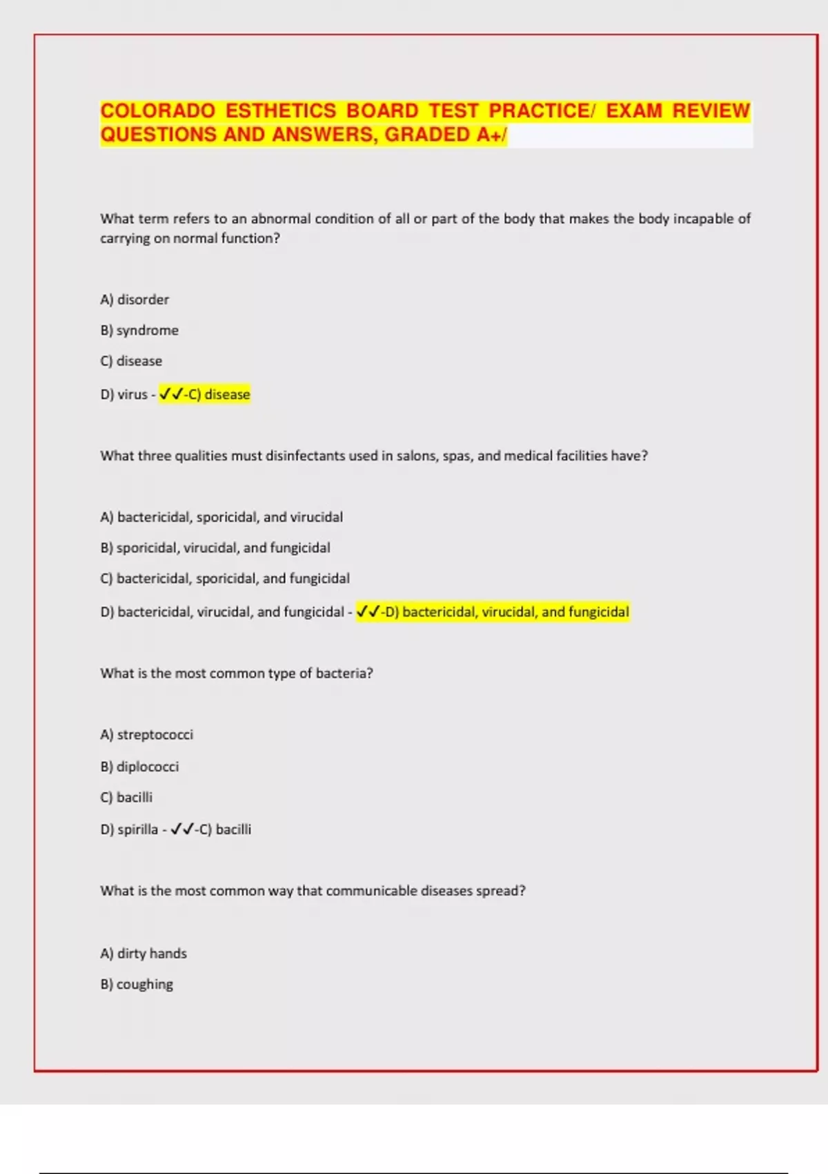 COLORADO ESTHETICS BOARD TEST PRACTICE/ EXAM REVIEW QUESTIONS AND ANSWERS, GRADED A+/ What term refers to an abnormal condition of all or part of the body that makes the body incapable of carrying on normal function? A) disorder B) syndrome C) disease D) virus - -C) disease What three qualities must disinfectants used in salons, spas, and medical facilities have? A) bactericidal, sporicidal, and virucidal B) sporicidal, virucidal, and fungicidal C) bactericidal, sporicidal, and fungicidal D) bactericidal, virucidal, and fungicidal - -D) bactericidal, virucidal, and fungicidal What is the most common type of bacteria? A) streptococci B) diplococci C) bacilli D) spirilla - -C) bacilli What is the most common way that communicable diseases spread? A) dirty hands B) coughing C) sneezing D) contaminated water - -A) dirty hands What is a sign that a client has human papilloma virus (HPV) or plantar warts? A) redness and swelling surrounding an open wound B) clusters of small black dots on the bottom of the foot C) splotchy skin on the cheeks, neck, and forehead D) areas of thickened skin and greenish specks around the nails - -B) clusters of small black dots on the bottom of the foot What is a type of fungus that affects plants or grows on inanimate objects, but does NOT cause human infections in the salon? A) mildew B) keratin C) onychomycosis D) dermophyte - -A) mildew