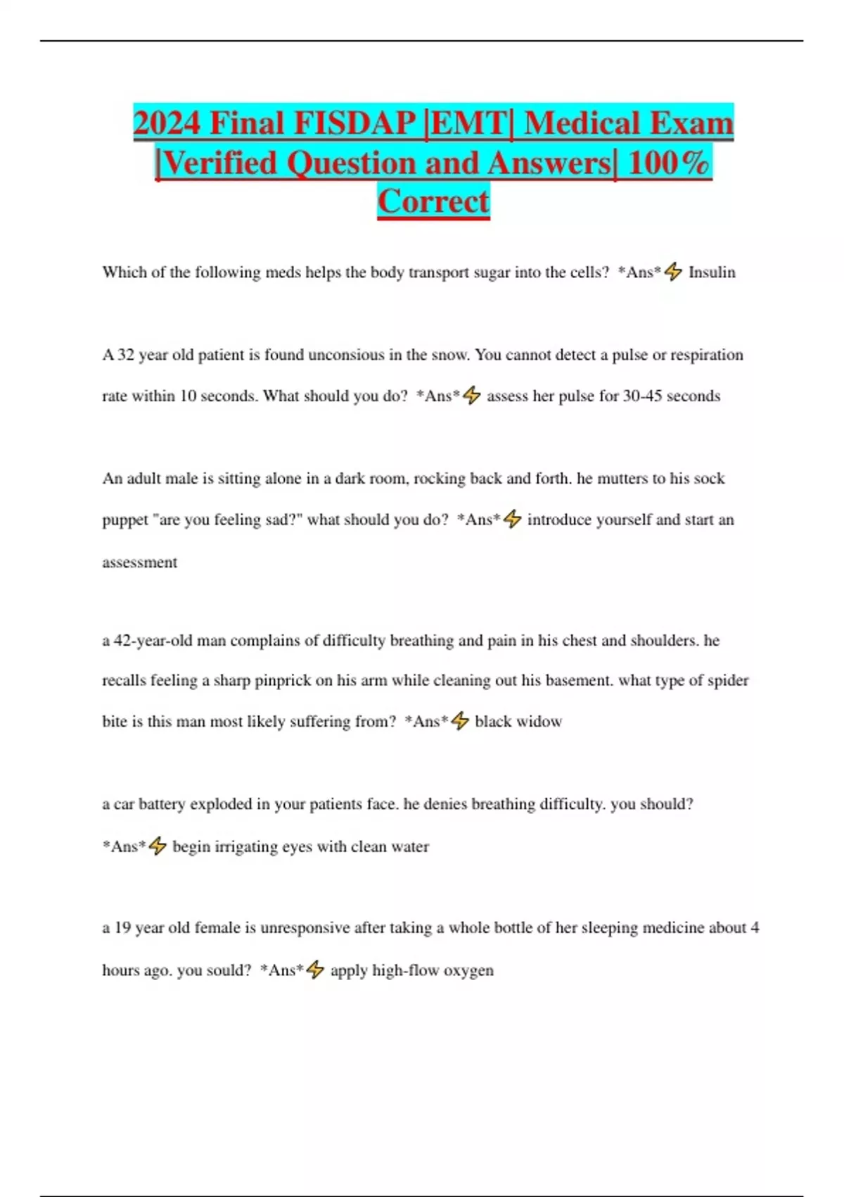 2024 Final FISDAP |EMT| Medical Exam |Verified Question and Answers| 100% Correct Which of the following meds helps the body transport sugar into the cells? *Ans* Insulin A 32 year old patient is found unconsious in the snow. You cannot detect a pulse or respiration rate within 10 seconds. What should you do? *Ans* assess her pulse for 30-45 seconds An adult male is sitting alone in a dark room, rocking back and forth. he mutters to his sock puppet "are you feeling sad?" what should you do? *Ans* introduce yourself and start an assessment a 42-year-old man complains of difficulty breathing and pain in his chest and shoulders. he recalls feeling a sharp pinprick on his arm while cleaning out his basement. what type of spider bite is this man most likely suffering from? *Ans* black widow a car battery exploded in your patients face. he denies breathing difficulty. you should? *Ans* begin irrigating eyes with clean water a 19 year old female is unresponsive after taking a whole bottle of her sleeping medicine about 4 hours ago. you sould? *Ans* apply high-flow oxygen a 32 year old male complains of photophobia (sensitivity to light) and vomiting. the most likely cause is? *Ans* migrane a 68 year old patient reports abdominal pain, vomiting and a loss of appetite, as well as black, tarry stools what should you expect? *Ans* upper GI bleeding a 21 year old male is unresponsive, has constricted pupils, slow, shallow respirations, you should suspect: *Ans* narcotic overdose a patient tells you he had anemia, you should expect him to present with? *Ans* jaundice your epileptic patient complains of persistent metallic taste in her mouth. you should suspect: *Ans* a seizure may occur patient is having a tonic-clonic seizure and is not breathing. you should: *Ans* prevent patient from further injury an 18 year old male states "the CIA is after me" you notice he has covered his head and windows with aluminum foil. when you ask why he says "in order to block out the government radio waves" vitals are BP138/34, P122, R24. you should suspect? *Ans* paranoid schizophrenia
