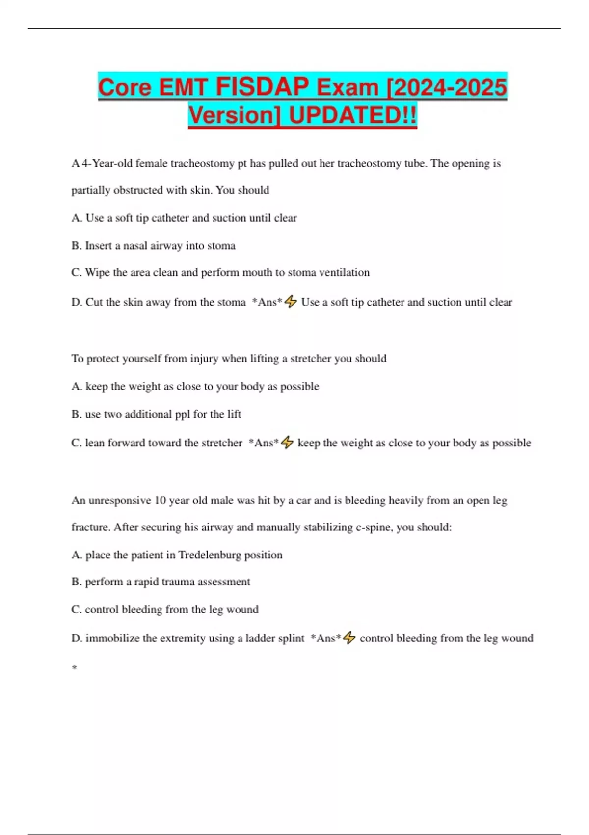 Core EMT FISDAP Exam [ Version] UPDATED!! A 4-Year-old female tracheostomy pt has pulled out her tracheostomy tube. The opening is partially obstructed with skin. You should A. Use a soft tip catheter and suction until clear B. Insert a nasal airway into stoma C. Wipe the area clean and perform mouth to stoma ventilation D. Cut the skin away from the stoma *Ans* Use a soft tip catheter and suction until clear To protect yourself from injury when lifting a stretcher you should A. keep the weight as close to your body as possible B. use two additional ppl for the lift C. lean forward toward the stretcher *Ans* keep the weight as close to your body as possible An unresponsive 10 year old male was hit by a car and is bleeding heavily from an open leg fracture. After securing his airway and manually stabilizing c-spine, you should: A. place the patient in Tredelenburg position B. perform a rapid trauma assessment C. control bleeding from the leg wound D. immobilize the extremity using a ladder splint *Ans* control bleeding from the leg wound * The strongest portion of the heart that is responsible for circulating blood to the entire body is the A. Left atrium B. Right atrium C. Left ventricle D. Right ventricle *Ans* Left ventricle A 46 y/o female was involved in a bar fight and has an obvious open neck wound. You should dress this wound with a/ an A. Occlusive dressing B. Sterile gauze dressing C. Pressure dressing D. Moist gauze dressing *Ans* Occlusive dressing * When assessing a pulse, you are feeling the: A. relaxation of the atria B. contraction of the left ventricle C. contraction of the left atrium D. relaxation of both ventricles *Ans* contraction of the left ventricle* A 60 y/o female has chest pain. She has not taken her prescribed nitro you should A. Determine what type of cardiac problem the pt has, and assist her with taking the nitro B. Immediately attached the AED and begin transport to hospital C. Administer aspirin only and withhold the nitro D. Consult medical direction with regard to assisting the pt in taking the nitro *Ans* Determine what type of cardiac problem the pt has, and assist her with taking the nitro Which of the following is the best definition of hypoperfusion? A. Less blood reaching capillary beds B. Inadequate oxygen delivery to cells C. Lowered heart rate and BP D. Blood vessel dilation causing distal pooling *Ans* Inadequate oxygen delivery to cells You are ventilating an apneic asthmatic patient with a BVM, but notice there is inadequate chest rise. What should you do? A. reassess the airway for an obstruction B. increase the ventilation pressure C. switch to an O2 powered ventilation device D. increase the rate of the ventilations *Ans* reassess the airway for an obstruction * For which of the following patients would an OPA be most appropriate? A. A 19 y/o with a mandible fracture who is only responsive to pain B. Unresponsive 25 y/o with a suspected spinal injury C. Unresponsive five-year-old with a suspected airway obstruction D. Semiconscious 76 y.o old who is gasping for air *Ans* Unresponsive 25 y/o with a suspected spinal injury Your patient is pale, diaphoretic, and complains of chest pressure. Her vitals are R 18 P 58, and BP 88/50. You should suspect A. Unstable angina B. A thoracic aneurysm C. Cardiogenic shock D. Pulmonary embolism *Ans* Cardiogenic shock A 66 y/o male is confused. He has a history of substance abuse and falls. His breath smells of alcoholic beverage. He is alert and refusing service. You should A. Obtain consent from his family and transport B. Document his refusal and recommend that he see his doctor C. Speak calmly to him and convince him to accept transport D. Have the police transport the pt to detox unit *Ans* Speak calmly to him and convince him to accept transport Your 12 yr old patient has a penetrating wound to the abdomen. You may provide care based on A. informed consent B. expressed consent C. implied consent *Ans* implied consent A victim of smoke inhalation has developed difficulty breathing. He does not like the smell of the mask you are using to deliver O2. You should A. Switch to a NC set to deliver O2 @ 6 LPM