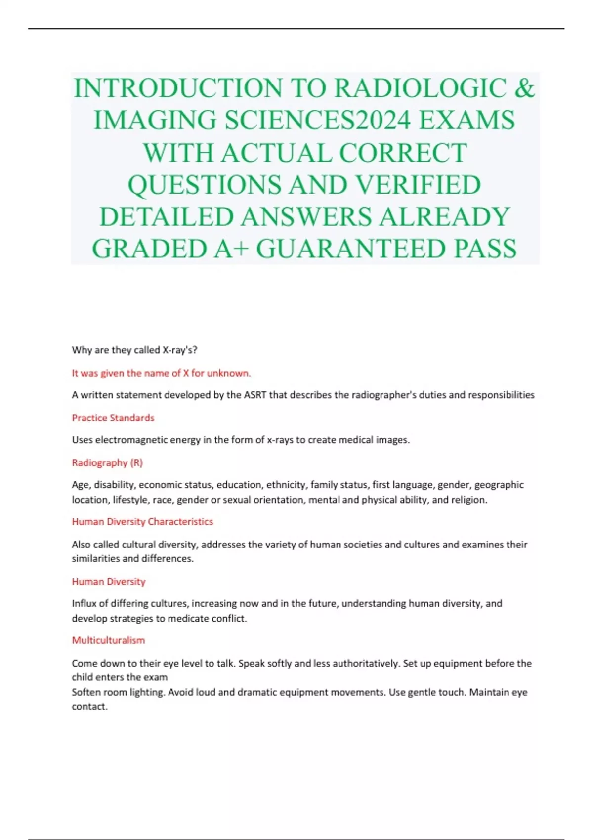 INTRODUCTION TO RADIOLOGIC & IMAGING SCIENCES2024 EXAMS WITH ACTUAL CORRECT QUESTIONS AND VERIFIED DETAILED ANSWERS ALREADY GRADED A+ GUARANTEED PASS