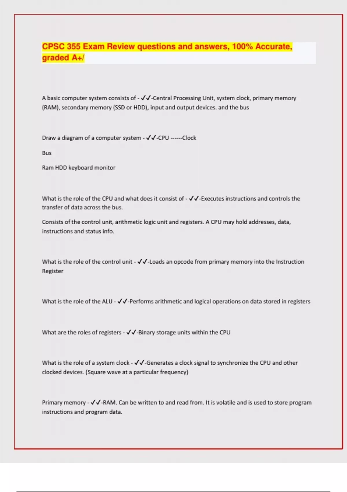 CPSC 355 Exam Review questions and answers, 100% Accurate, graded A+/ A basic computer system consists of - -Central Processing Unit, system clock, primary memory (RAM), secondary memory (SSD or HDD), input and output devices. and the bus Draw a diagram of a computer system - -CPU ------Clock Bus Ram HDD keyboard monitor What is the role of the CPU and what does it consist of - -Executes instructions and controls the transfer of data across the bus. Consists of the control unit, arithmetic logic unit and registers. A CPU may hold addresses, data, instructions and status info. What is the role of the control unit - -Loads an opcode from primary memory into the Instruction Register What is the role of the ALU - -Performs arithmetic and logical operations on data stored in registers What are the roles of registers - -Binary storage units within the CPU What is the role of a system clock - -Generates a clock signal to synchronize the CPU and other clocked devices. (Square wave at a particular frequency) Primary memory - -RAM. Can be written to and read from. It is volatile and is used to store program instructions and program data. What is the bus - -A set of parallel data/signal lines and is used to transfer info between computer components. How is the bus subdivided - -Address bus: specifies a memory location in RAM Data bus: used for bidirectional data transfer Control bus: used to control or monitor devices connected to the bus Secondary memory - -Used to hold a computer's file system. Is non-volatile. Stored on an HDD or SSD Basic CPU Architectures: Accumulator Machines - -Draw a diagram Basic CPU Architectures: load/store machines - -Draw a diagram RISC - -Uses simple instructions that can be executed in one machine cycle. Larger programs CISC - -May have instructions that take many cycles to execute What are pseudo-ops or assembler directives - -Give the assembler extra needed info What are assemblers - -Translate assembly source code into machine code. Macros - -Allow you to define a register with a name. When compiling invoke m4, to redirect output to a file ending in .s ARMv8-A architecture - -Is a RISC Is a load/store machine Uses a von Neumann architecture for